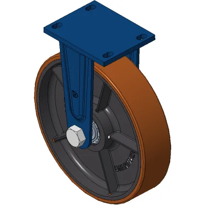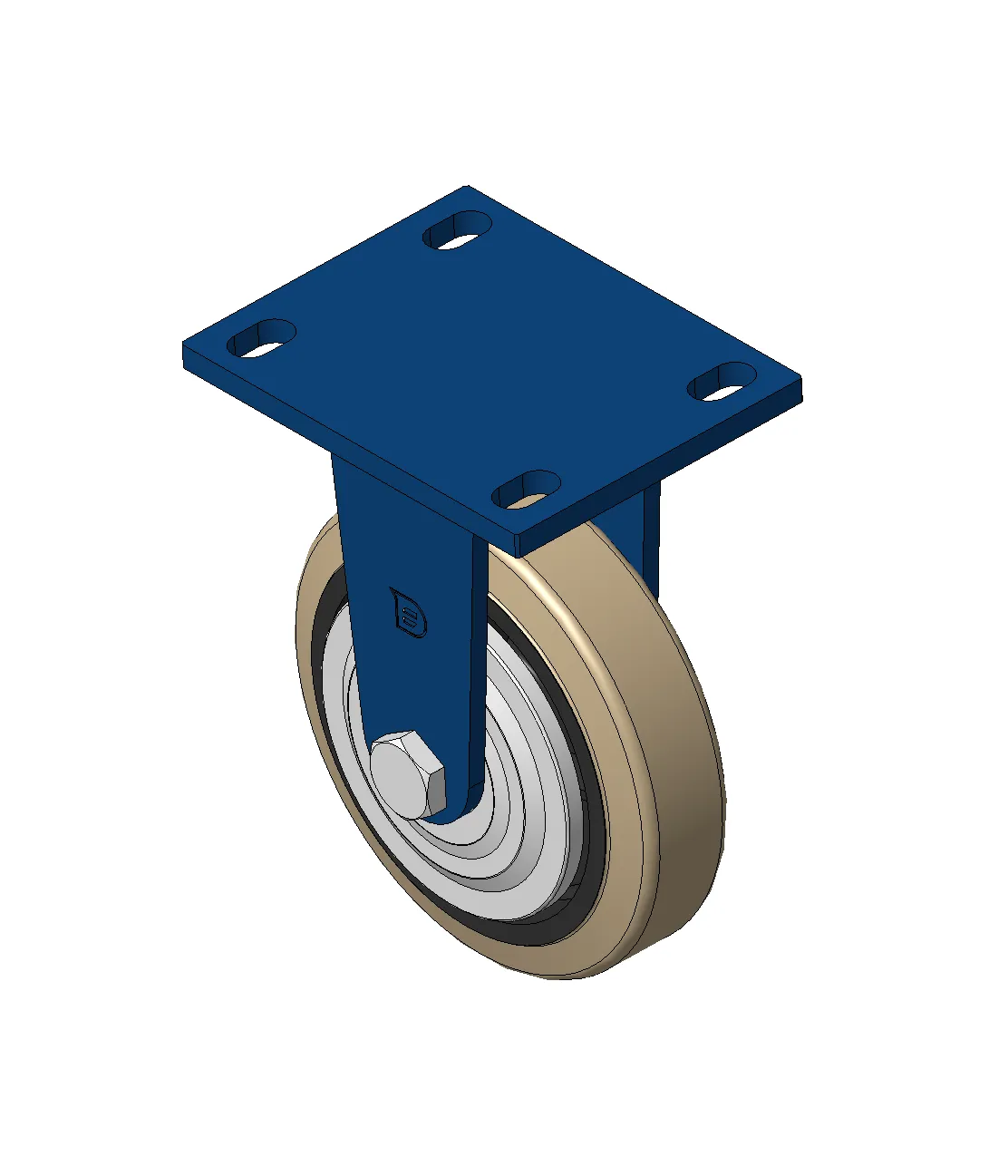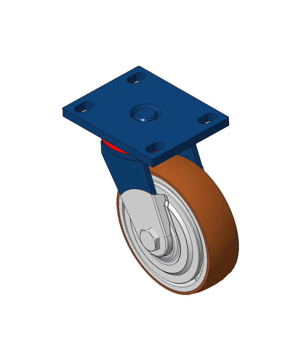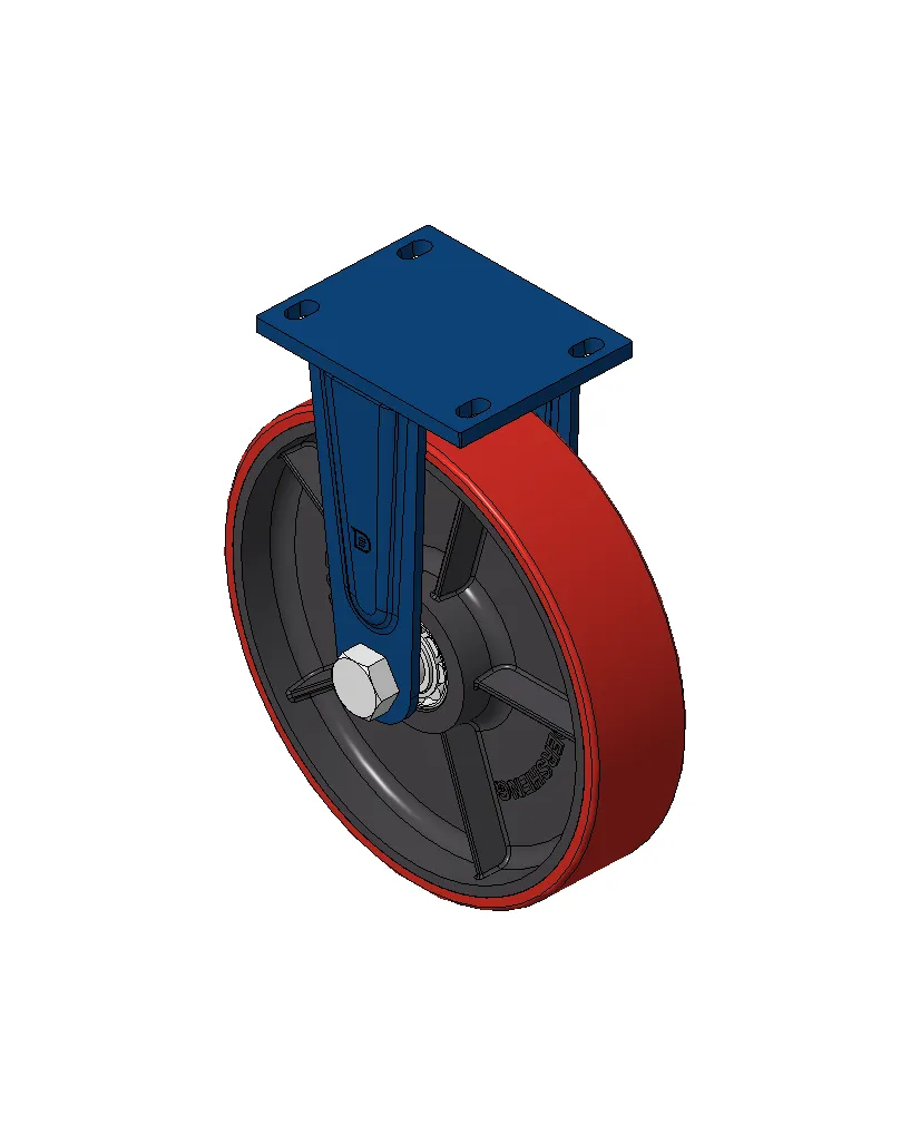 Rigid Caster with Welded Caster Fork and blue paint finish. Mounting Type - Top Plate, 140x85 Bolt Hole Spacing. Cast Iron Wheel Center with High Quality Polyurethane tread, Cast Iron red. Bearing—Ball Bearing.