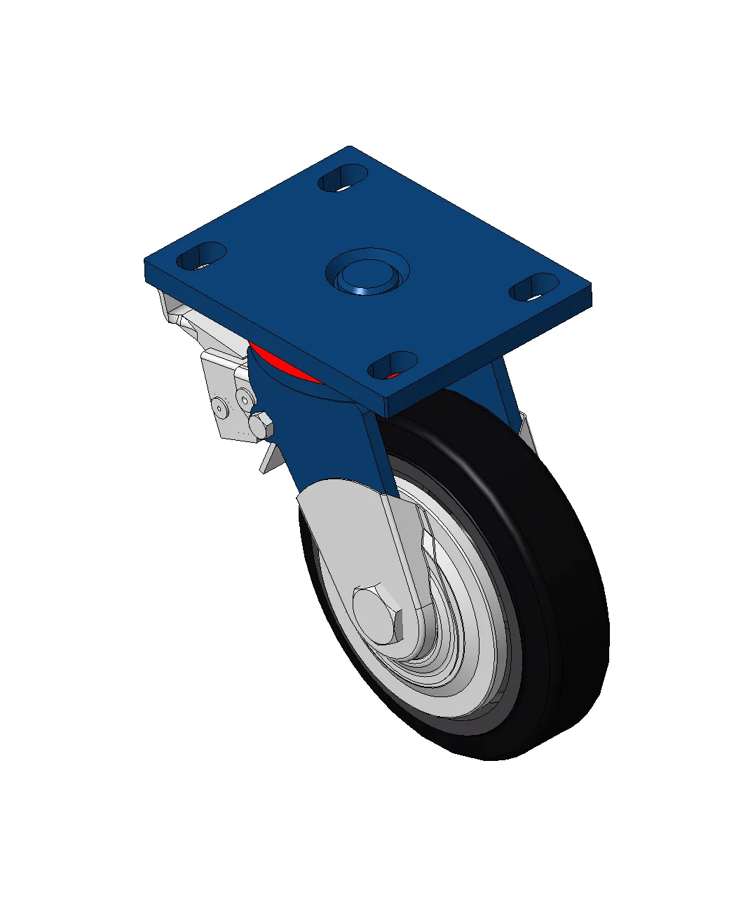 Rear Brake Locking system, Welded Caster Fork Blue-painted finish, Mounting Type - Top Plate, 110x75 Bolt Hole Spacing Cast Iron Wheel Center, High-Quality, highly Resilient Rubber tread, Cast Iron in Natural Color Bearing—Ball Bearing