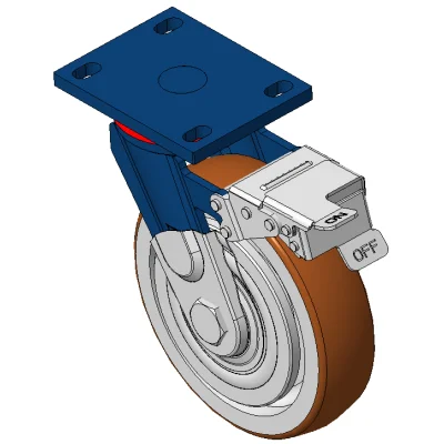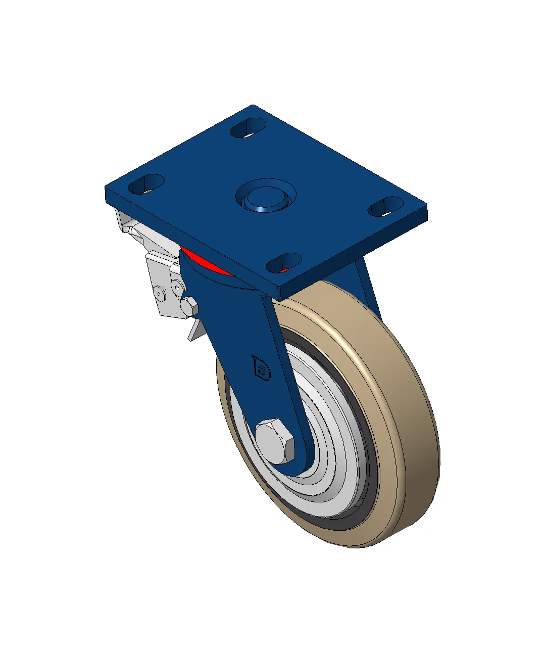 Casters with Front Brake locking system, Welded Caster Fork, blue painted finish Mounting Type - Top Plate, 110x75 Bolt Hole Spacing Cast Iron Wheel Center, High Quality Polyurethane tread, Cast Iron brown Bearing—Ball Bearing with special Anti-thread wheel cover