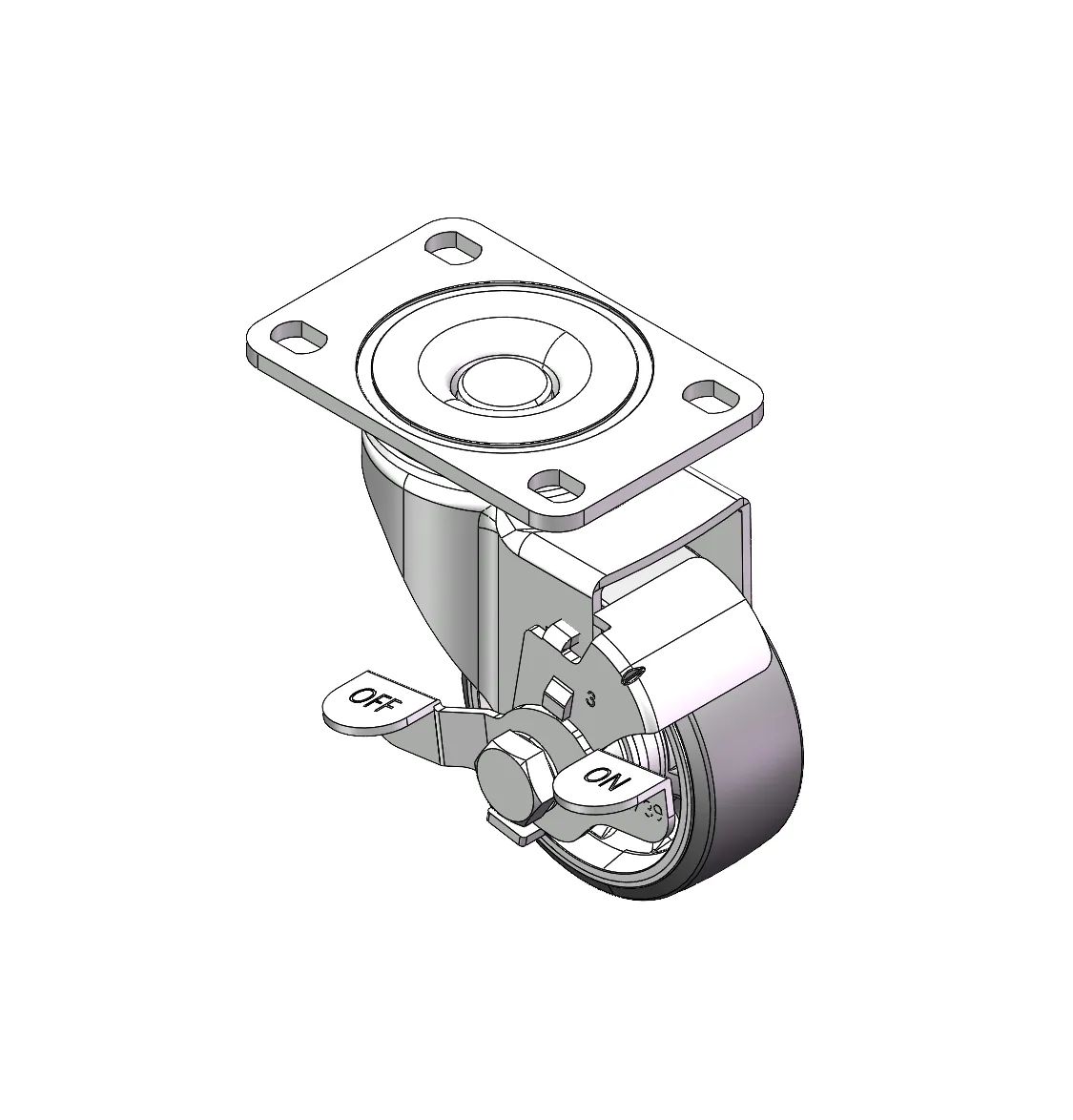 Casters with Side Brakes and With locking system. Top Plate with Riveted Fork and 75 x 45 mm (3" x 1-3/4") Bolt Hole Spacing.