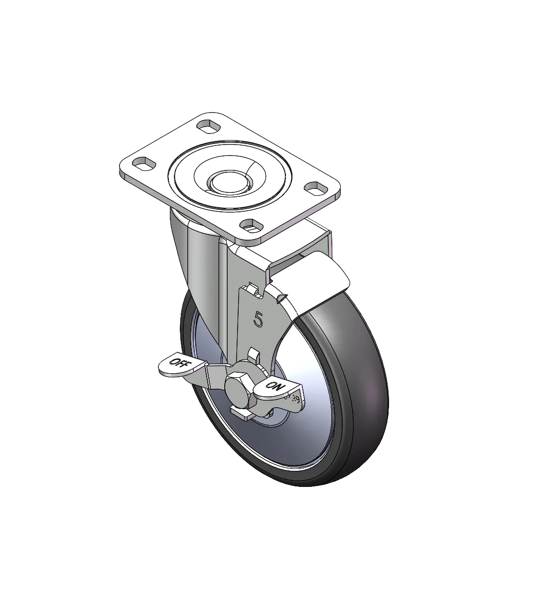 Casters with a Total Brake and With locking system. Top Plate Riveted and Stamping with 75 x 45 mm (3" x 1-3/4") Bolt Hole Spacing.