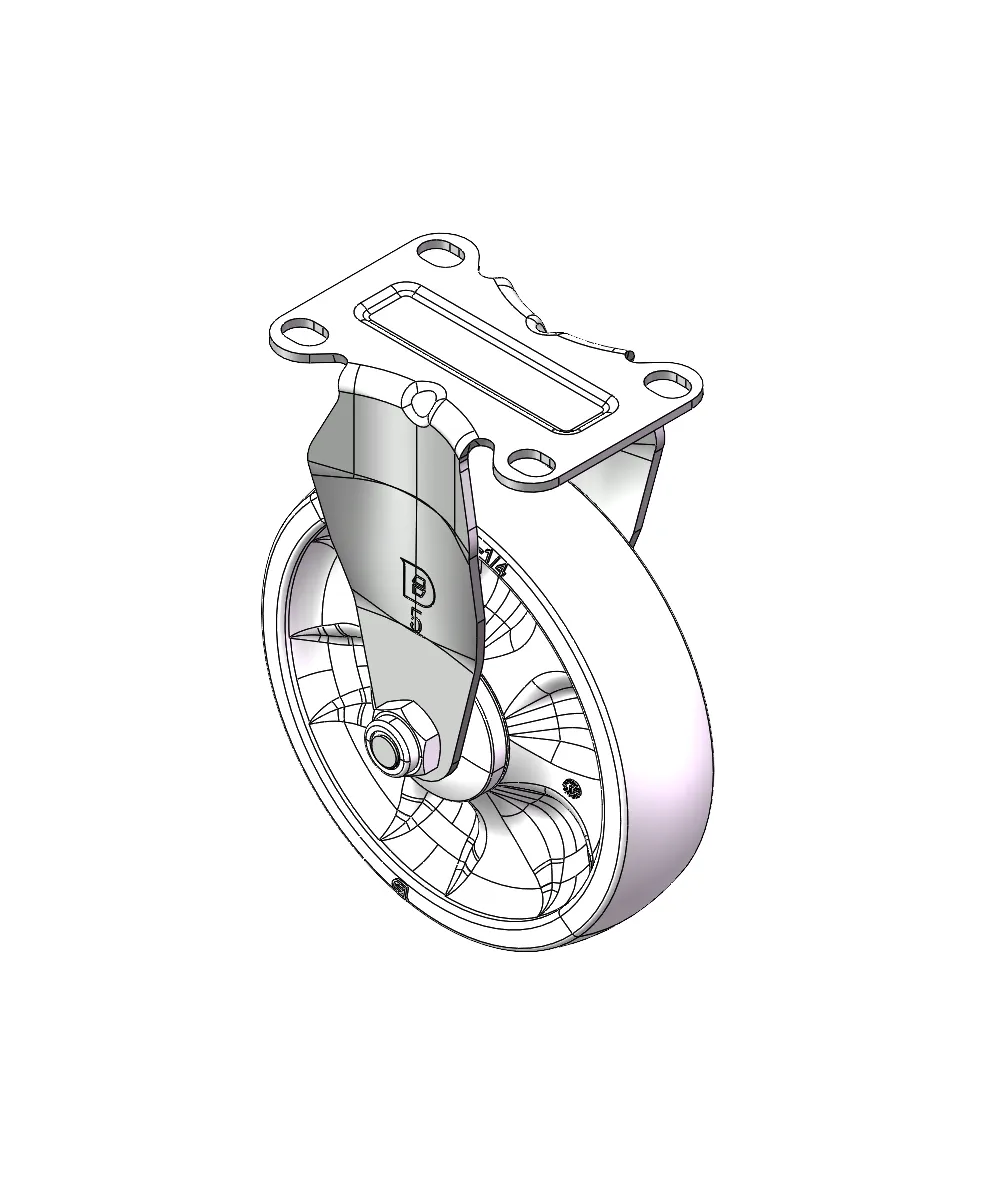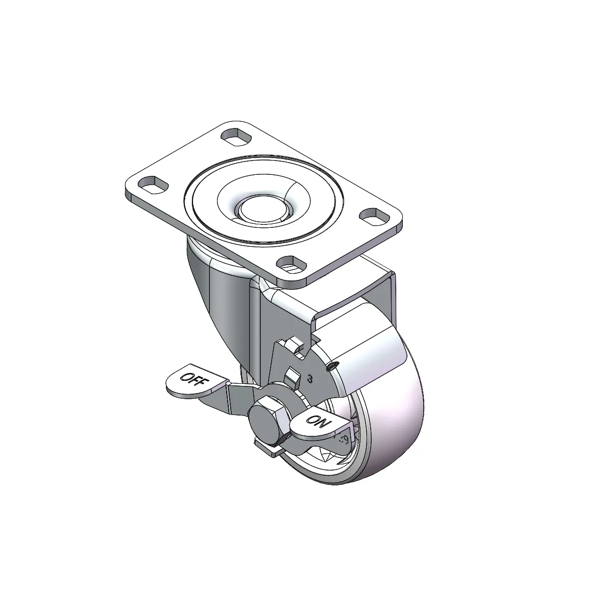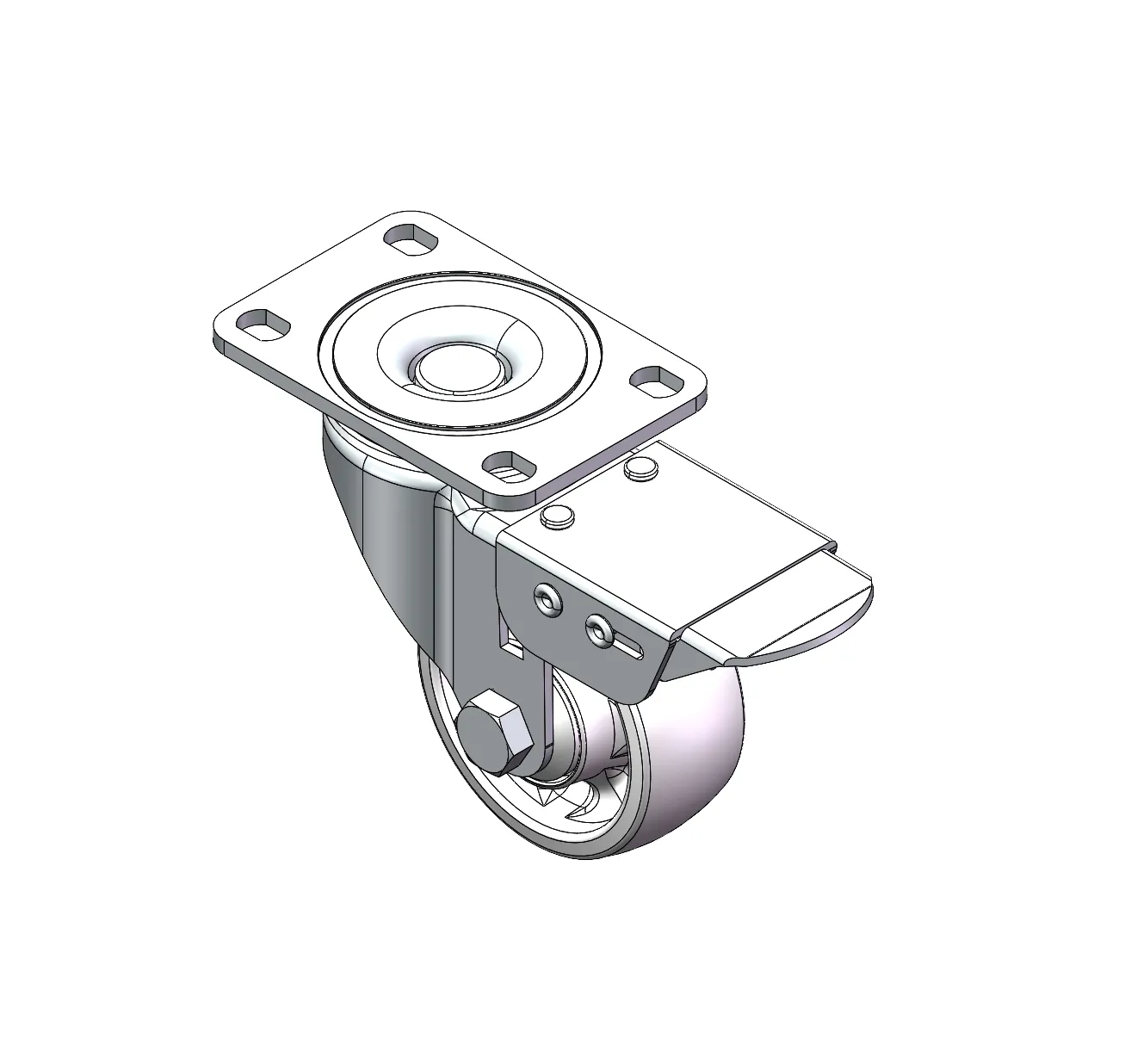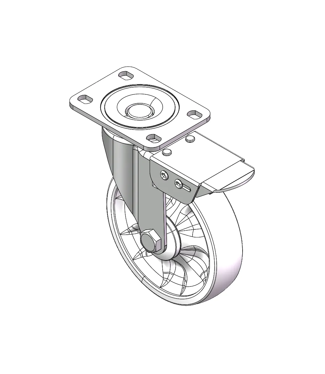 Casters with Total Brakes and With locking system. Top Plate with Riveted, Stamping Fork—75 x 45 mm (3" x 1-3/4") Bolt Hole Spacing.