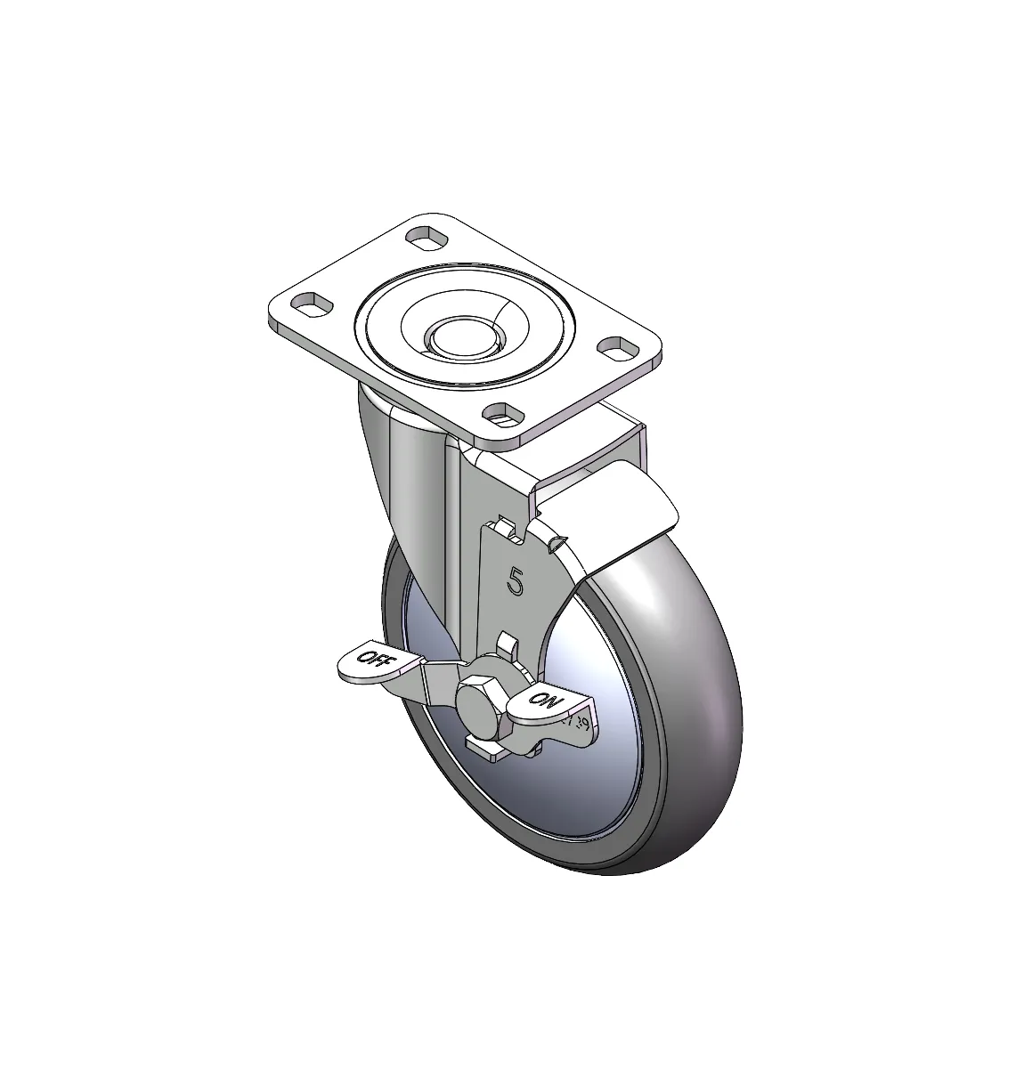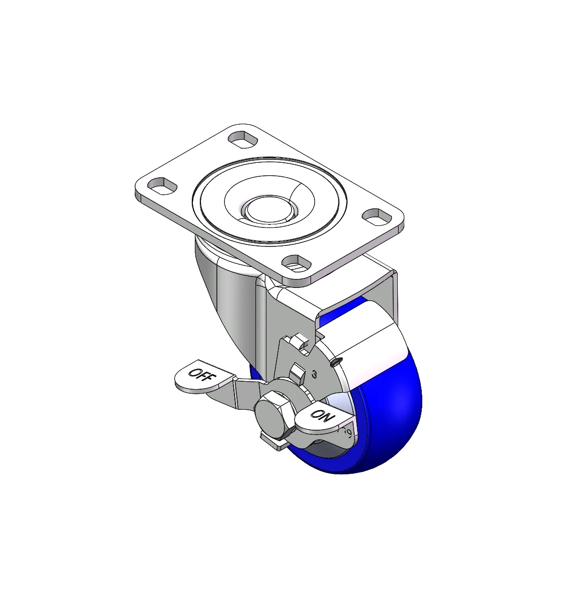Casters with a Total Brake and With locking system. Top Plate with Riveted, Stamping Fork and 75 x 45 mm (3" x 1-3/4") Bolt Hole Spacing.