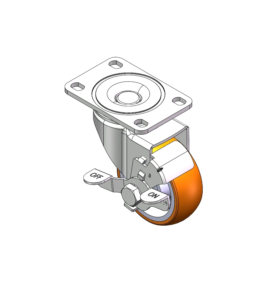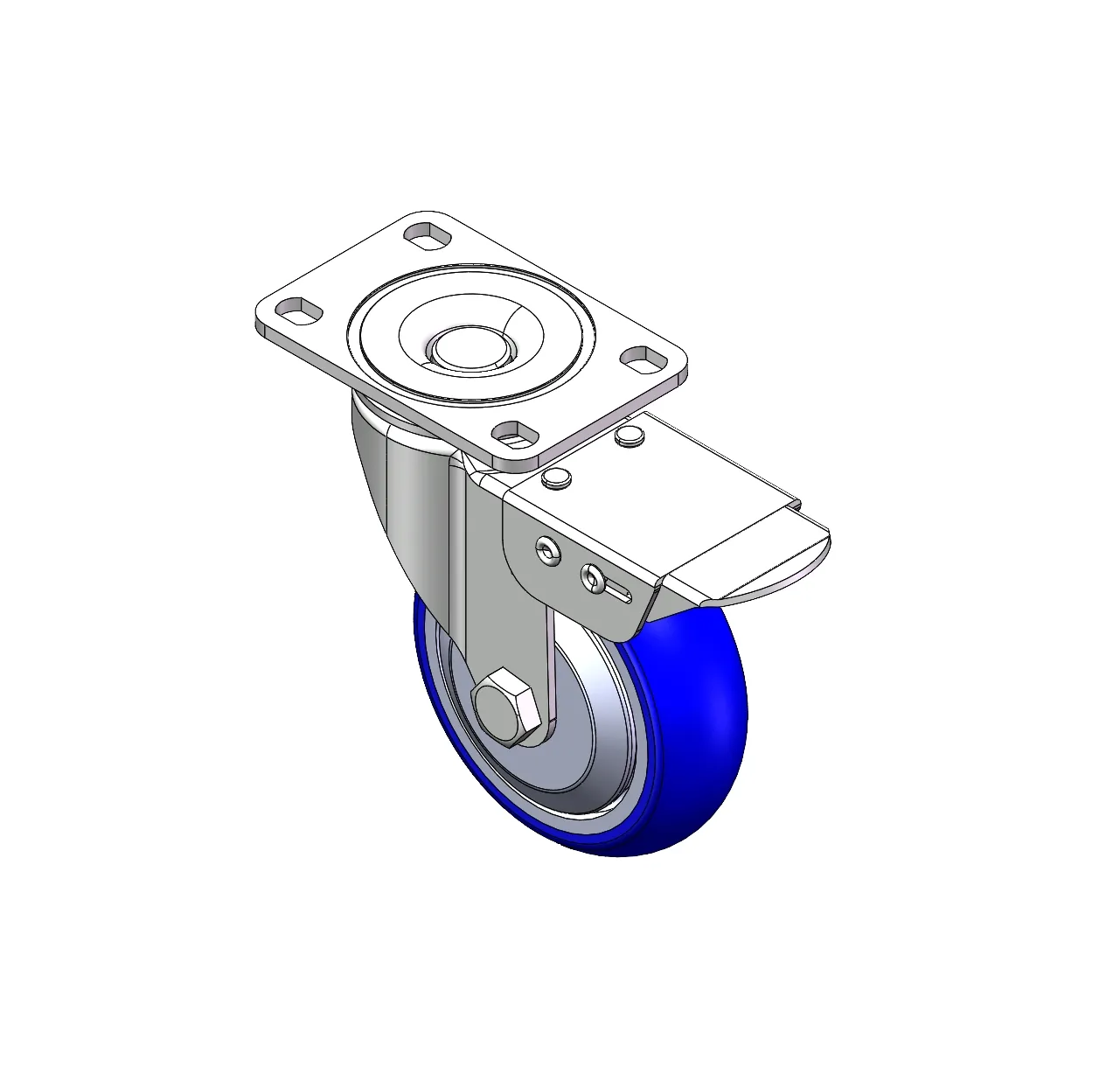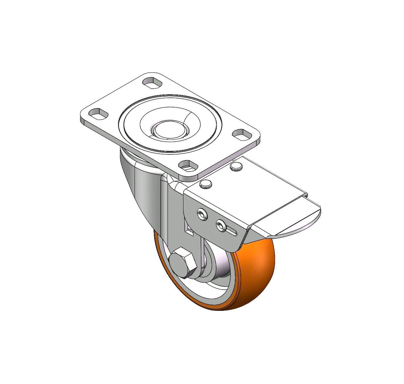 Casters with a Total Brake and With locking system. Top Plate with Riveted, Stamping Fork and 75 x 45 mm (3" x 1-3/4") Bolt Hole Spacing.