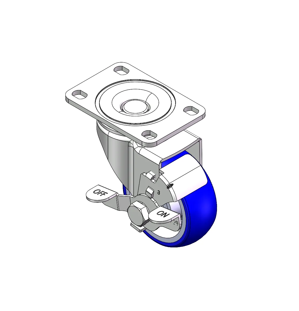 Casters with Side Brakes and With locking system. Top Plate with Riveted, Stamping Fork and 75 x 45 mm (3" x 1-3/4") Bolt Hole Spacing.