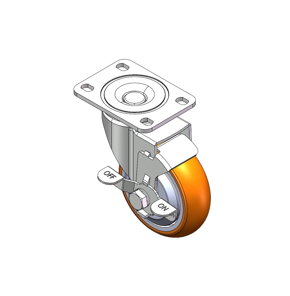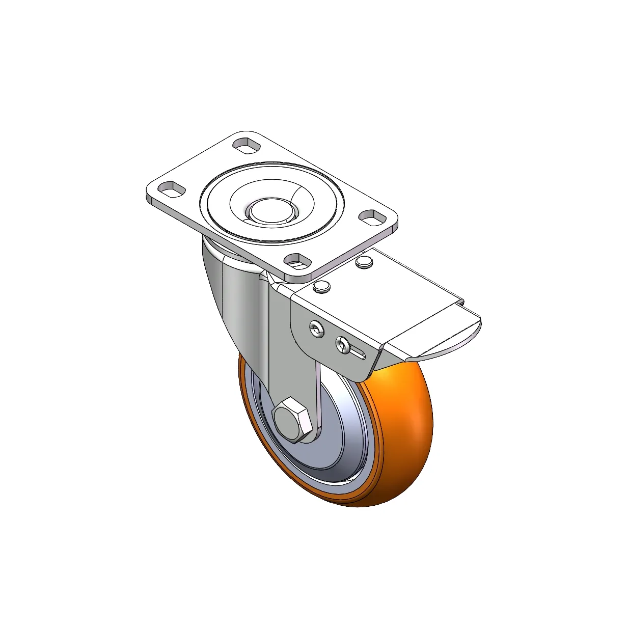 Casters with a Total Brake and With locking system. Top Plate with Riveted, Stamping Fork and 75 x 45 mm (3" x 1-3/4") Bolt Hole Spacing.