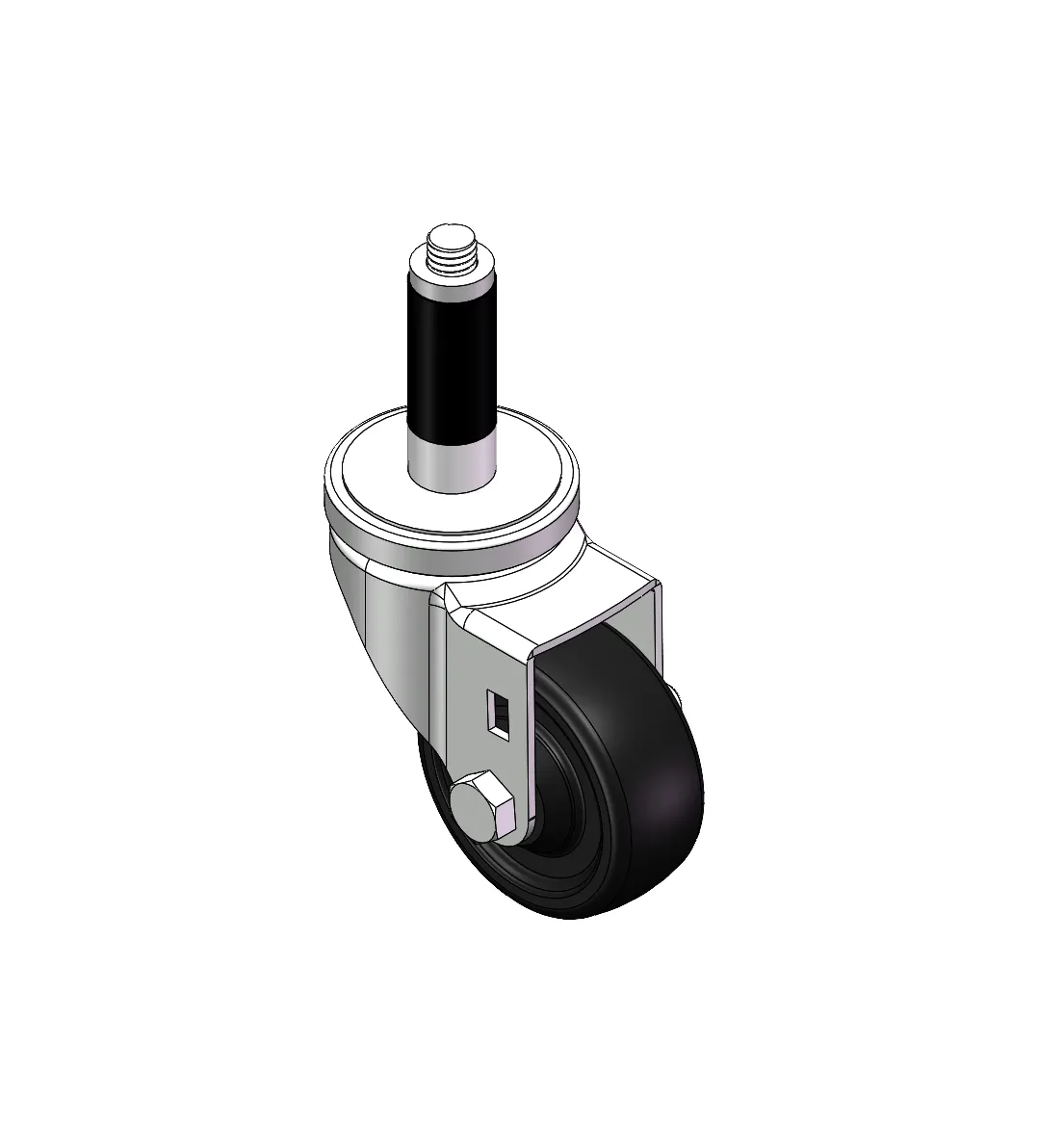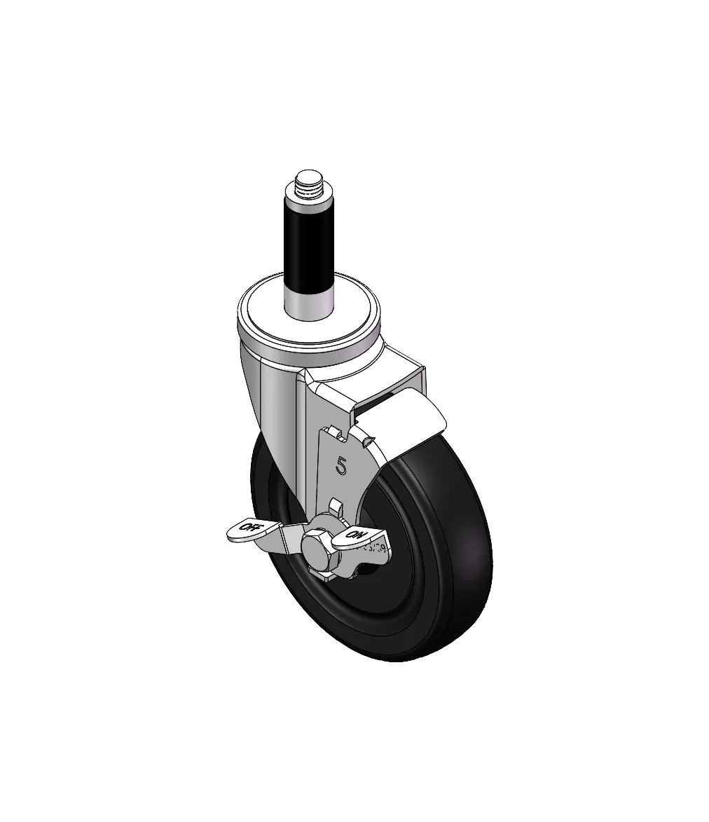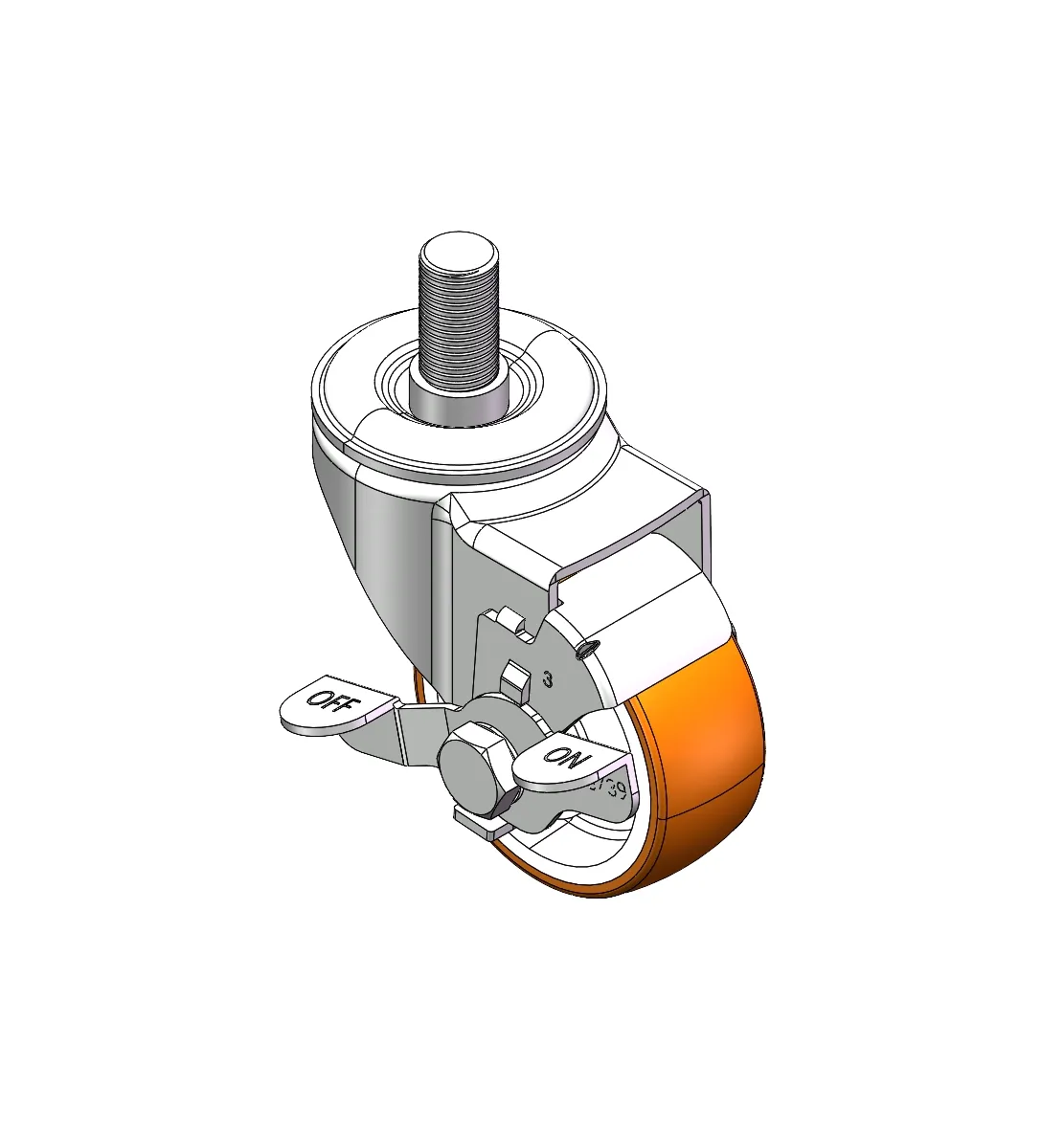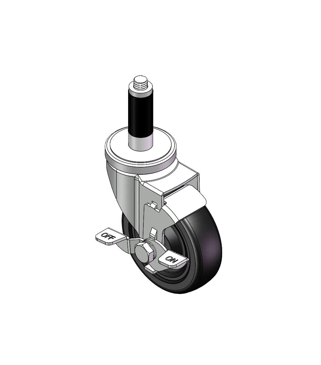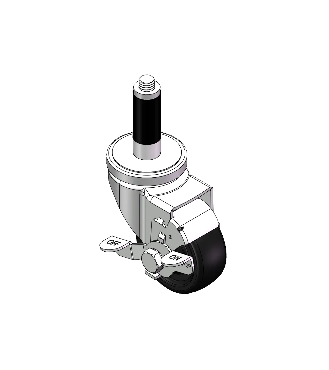 Casters with Side Brakes and With locking system. Threaded Stem Riveted Pressed Fork – 1/2"-13" Zine-Plated, expansion Mounting Type (∅21.6-∅24) Reinforced Polypropylene Wheel Center, High-Quality Resilient Rubber Wheel Tread Bearing – Plain Bearing