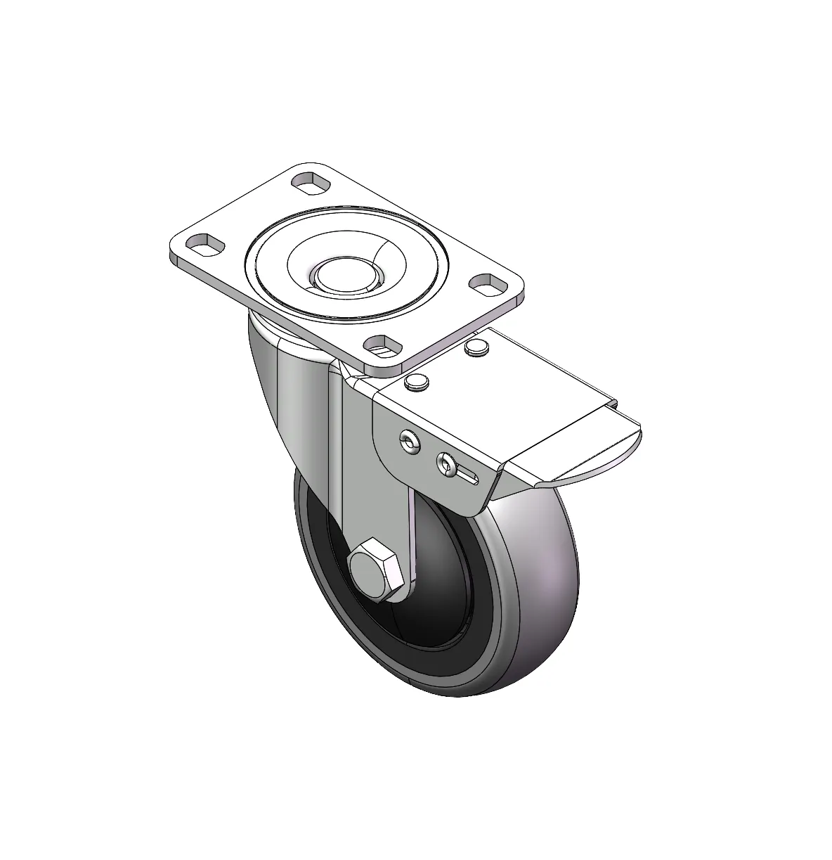 Castors with Total Brake locking system. Base Riveted Fork - premium Hole Surface Zine-Plated, Top Plate (4T) Mounting Type Impact resistant High-quality Impact Resistance Polypropylene Wheel Center,High-Quality Thermoplastic Rubber (TPR) Wheel Tread Black grey, Bearing - Ball Bearing.