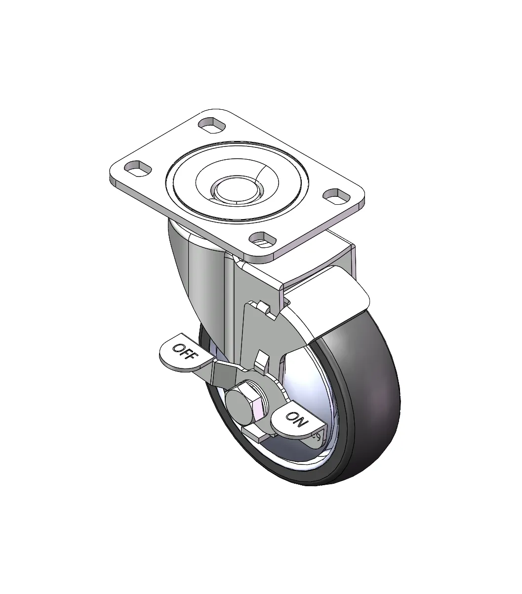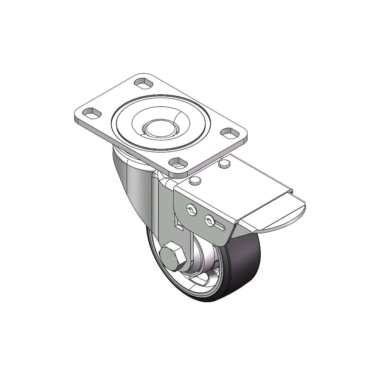 Castors with Side Brakes, Locking system. Riveted Stamping Fork - 75 x 45 mm (3" x 1-3/4") Bolt Hole Spacing Surface Zine-Plated, Fork (4T) Mounting Type Impact resistant High-quality Impact Resistance Polypropylene Wheel Center, Thermoplastic Elastomer (TPR) Wheel Tread Pearl grey, wheels - Plain Bearing.