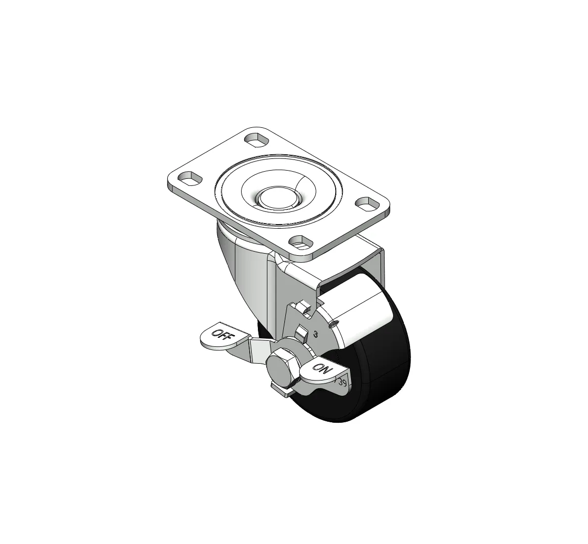 Castors with Side Brake and Locking system. Top Plate Riveted Stamping Fork - 75 x 45 mm (3" x 1-3/4") Bolt Hole Spacing Extended control lever surface, Top Plate (4T) installation device Cast Iron Wheel Center, high quality polyurethane wheel tread Iron black, Bearing—Ball Bearing.