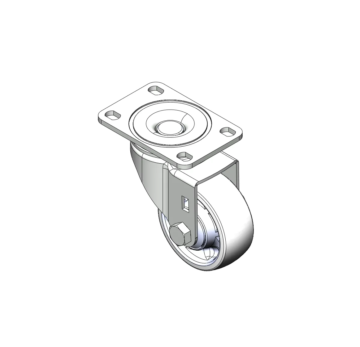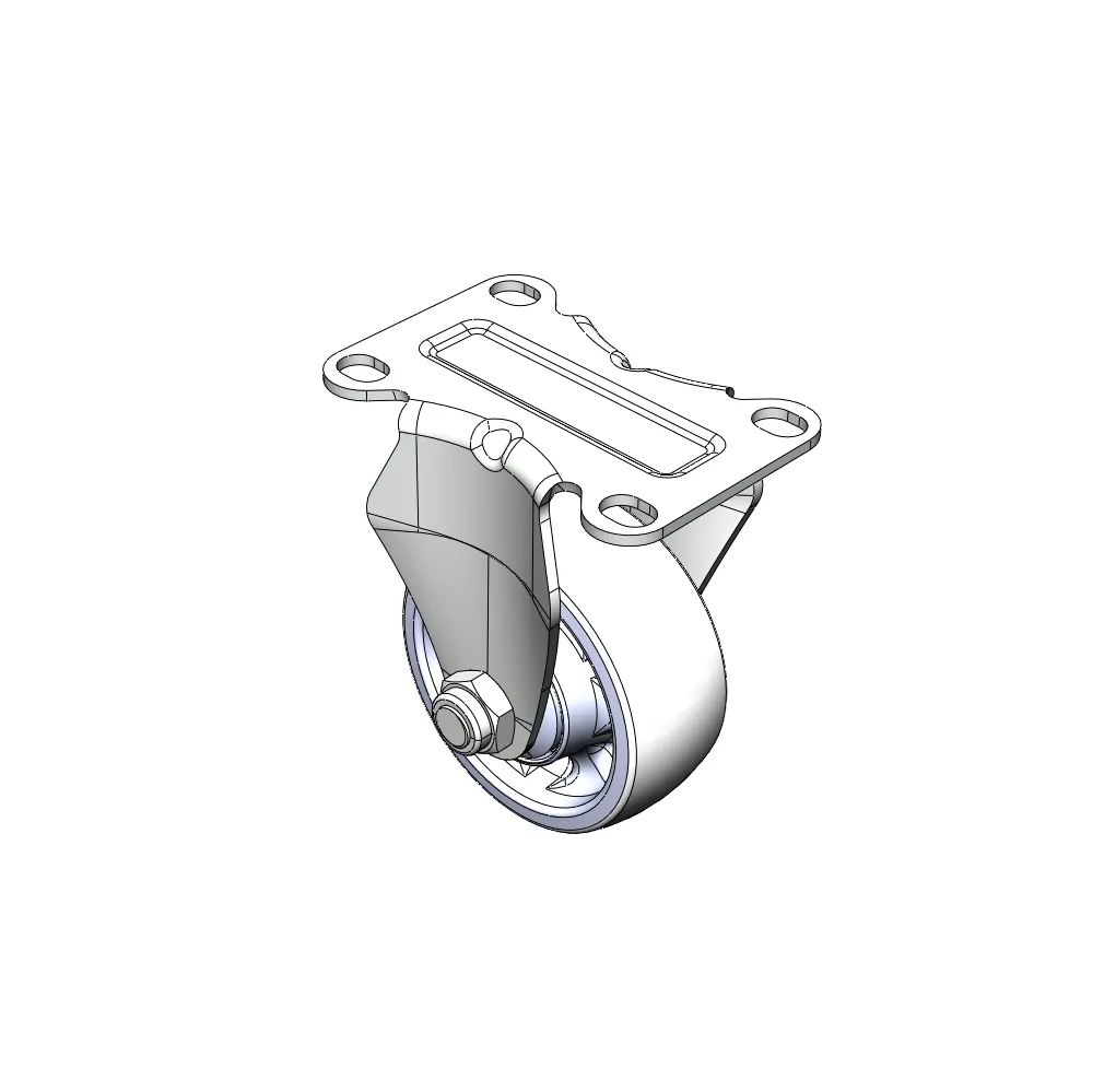 Rigid castors, Stamping Fabricated Caster Fork - 75 x 45 mm (3" x 1-3/4") Bolt Hole Spacings Extended control lever surface, Top Plate installation Polypropylene Wheel Center, Wheel Tread White, Bearing - Ball Bearings.