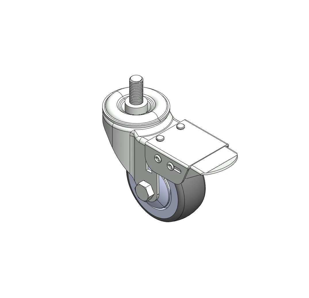 Castors with Total Brake Locking system. Threaded Fork - M12-P1.75 Extended control lever surface, Mounting Type - Threaded Stem High-quality Impact Resistance Polypropylene Wheel Center,High-Quality Thermoplastic Rubber (TPR) Wheel Tread Grey, Bearing - Ball Bearing.