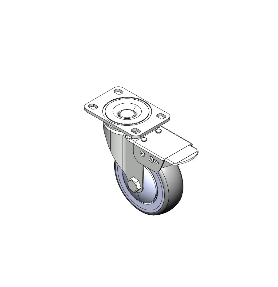 Castors with Total Brake locking system. Top Plate Riveted Fork - premium Hole Surface Zine-Plated, Top Plate (4T) Mounting Type Impact resistant High-quality Impact Resistance Polypropylene Wheel Center,High-Quality Thermoplastic Rubber (TPR) Wheel Tread Grey, Bearing - Ball Bearing.
