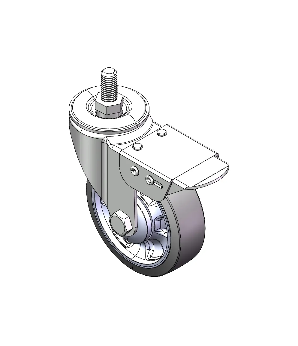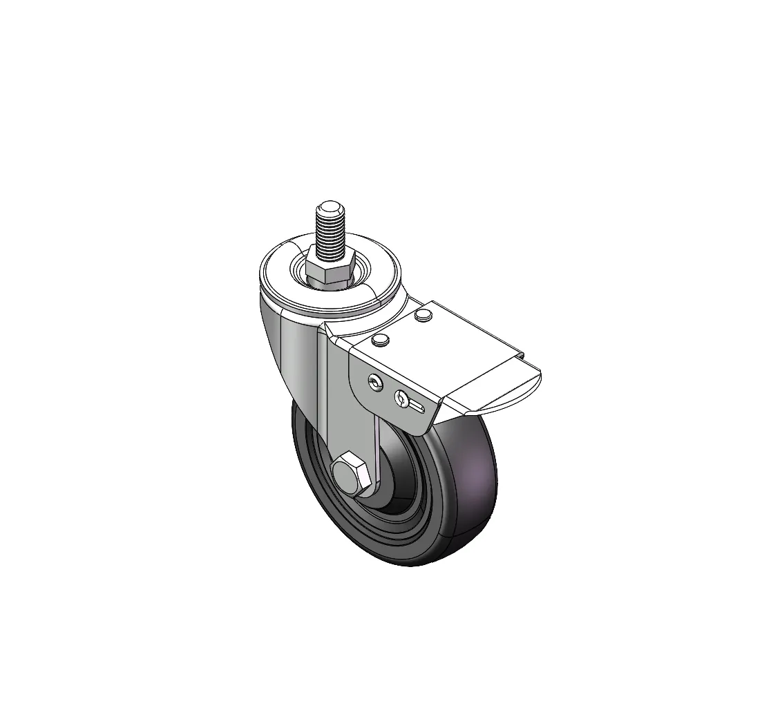 Casters with Side Brakes and With locking system. Threaded Stem Riveted Pressed Fork 1/2"-12" Zine-Plated, Mounting Type - Threaded Stem Reinforced impact-resistant polypropylene Wheel Center, High-Quality Reinforced Polypropylene Rubber (TPR) Wheel Tread Pearl-finish dark gray, Bearing – Ball Bearings.