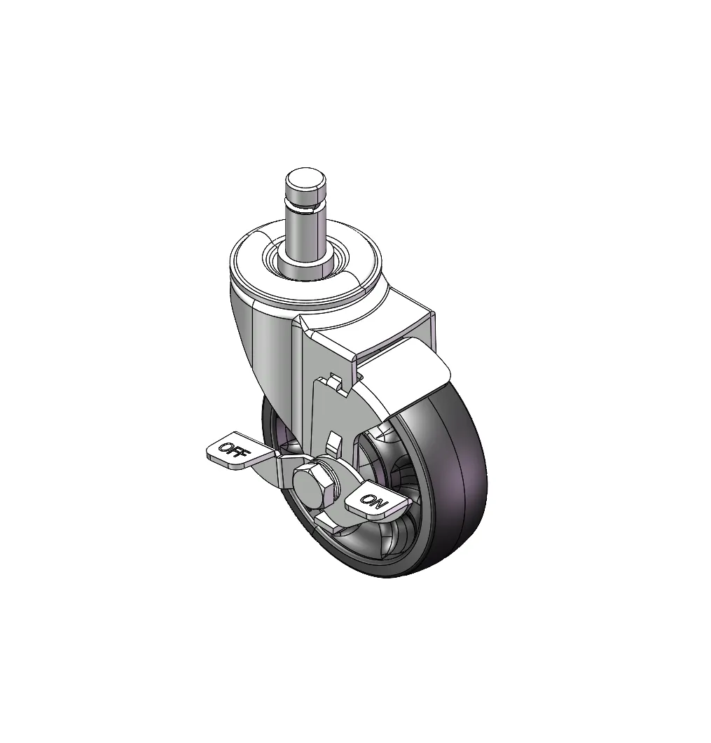 Castors with Side Brakes and Locking system. Riveted Fork with plug-in rods —∅15.7 Surface Zine-Plated, plug-in rod Mounting Type device Polypropylene Wheel Center and Wheel Tread Black, Bearing — Ball Bearings.