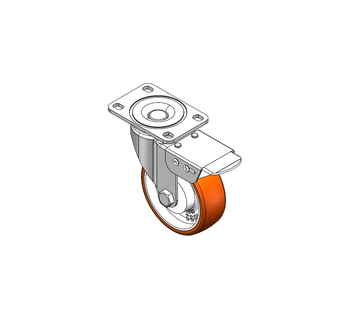 Castors with Total Brake Locking system. Top Plate Riveted Stamping Fork - 75 x 45 mm (3" x 1-3/4") Bolt Hole Spacing Surface Zine-Plated, Top Plate (4T) Mounting Type device Cast Iron Wheel Center, High Quality Polyurethane Wheel Tread Brown, Bearing - Ball Bearing.
