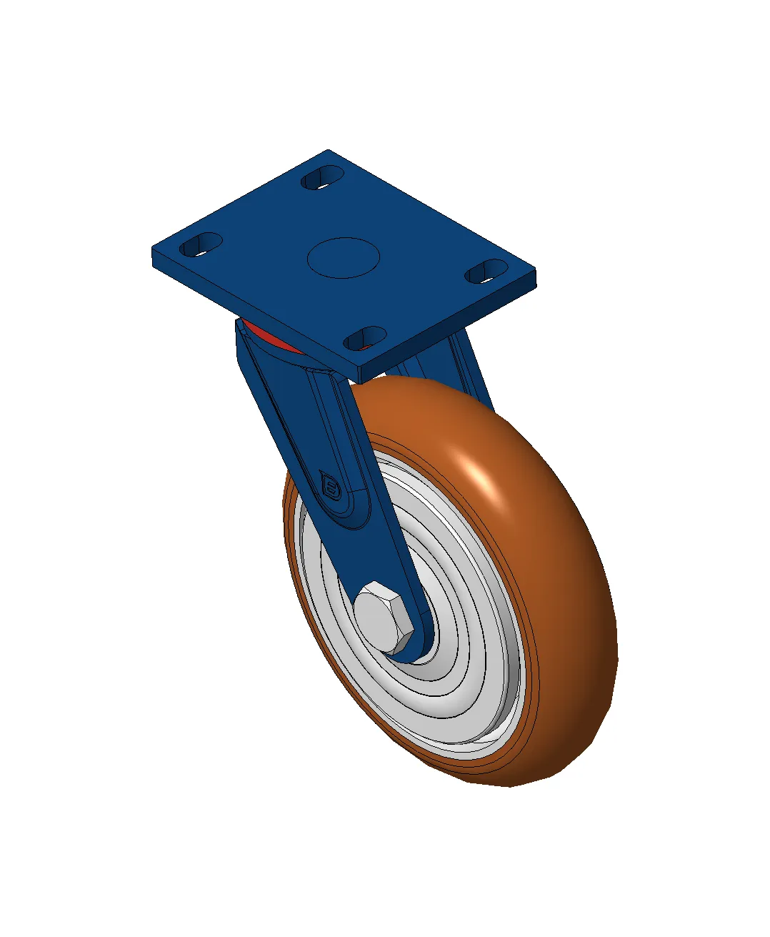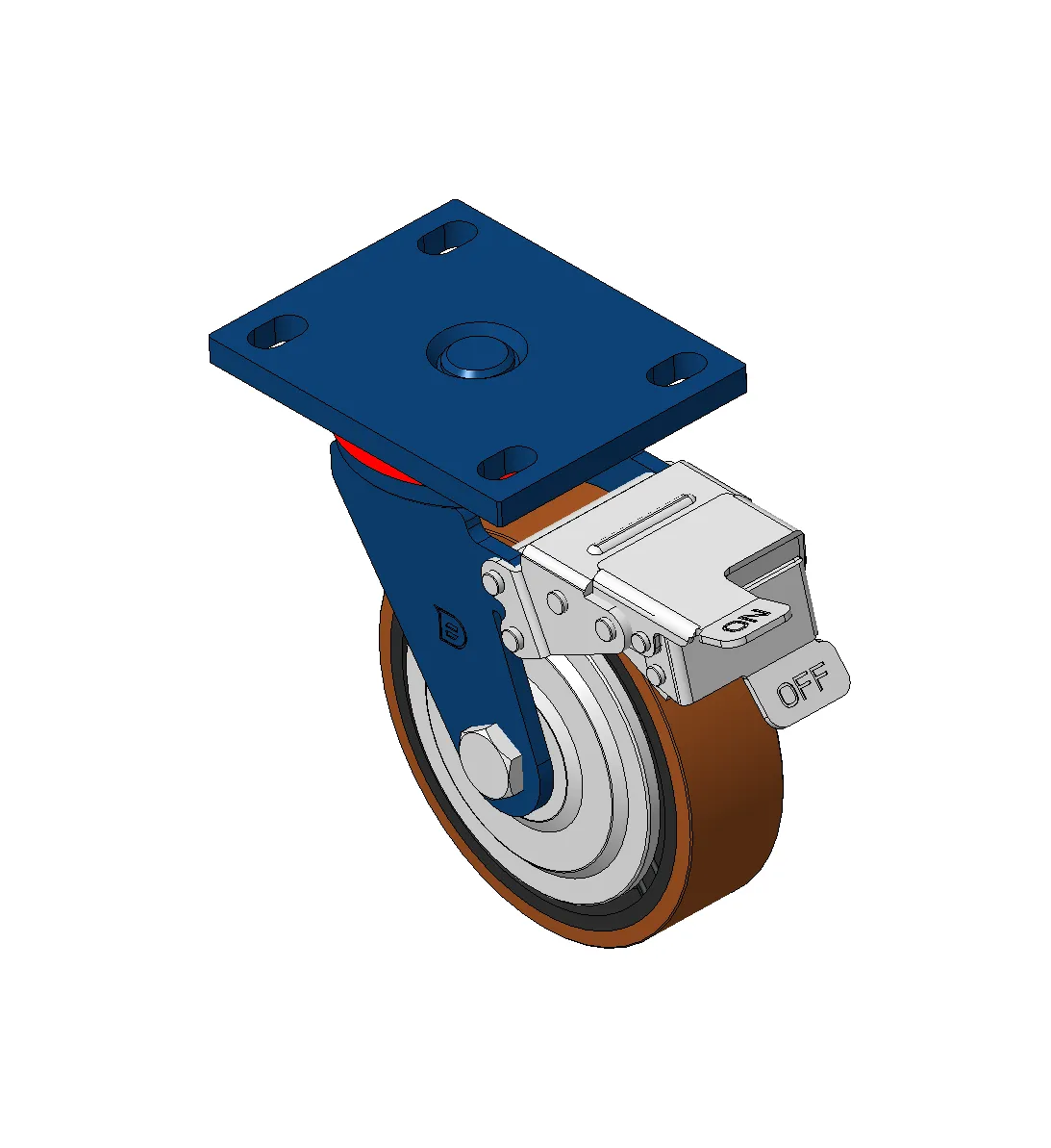 Casters with Front Brake locking system, Welded Caster Fork Blue-painted finish, Mounting Type - Top Plate, 110x75 Bolt Hole Spacing Cast Iron Wheel Center, High Quality Polyurethane tread, Cast Iron brown Bearing—Ball Bearing