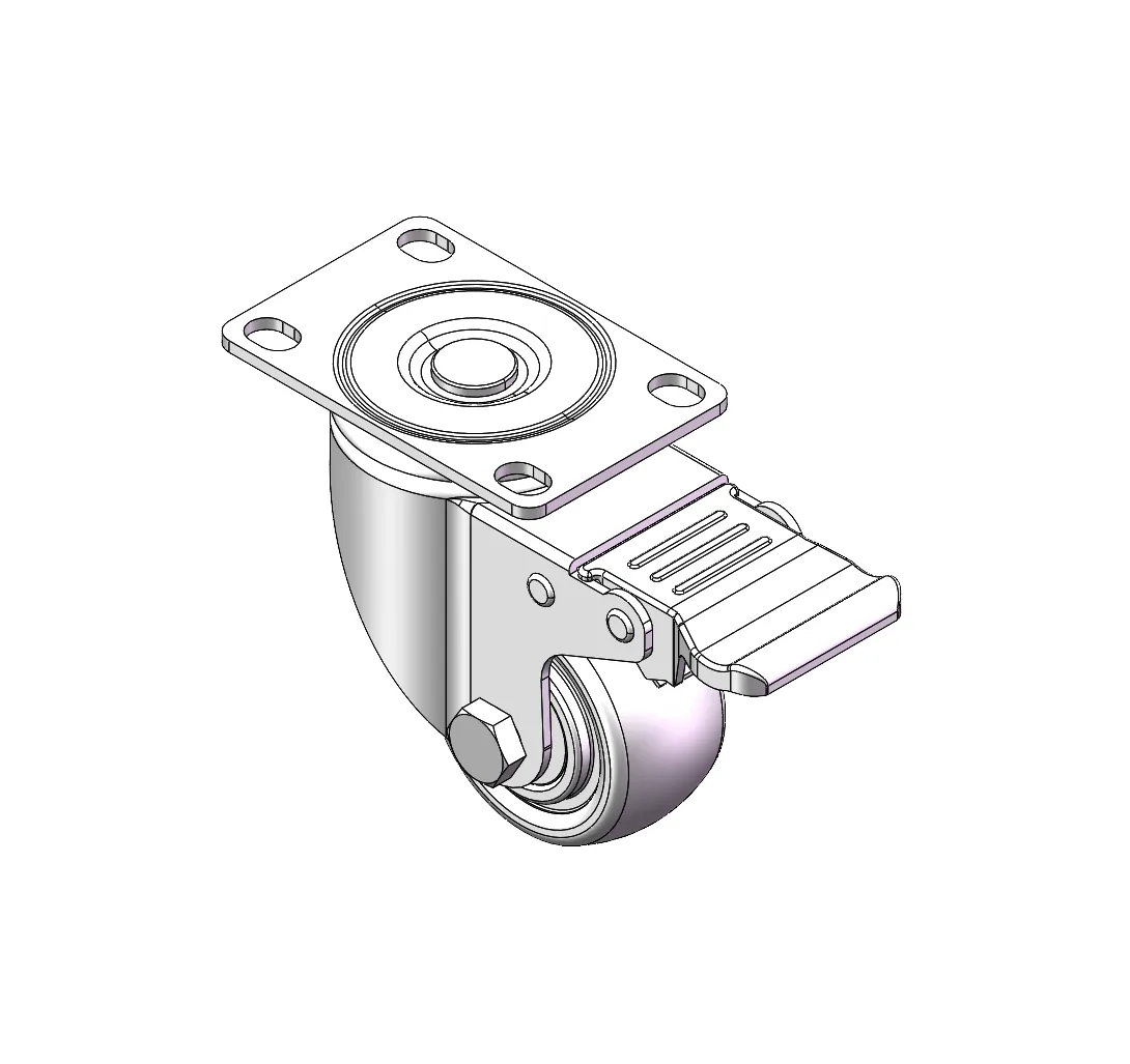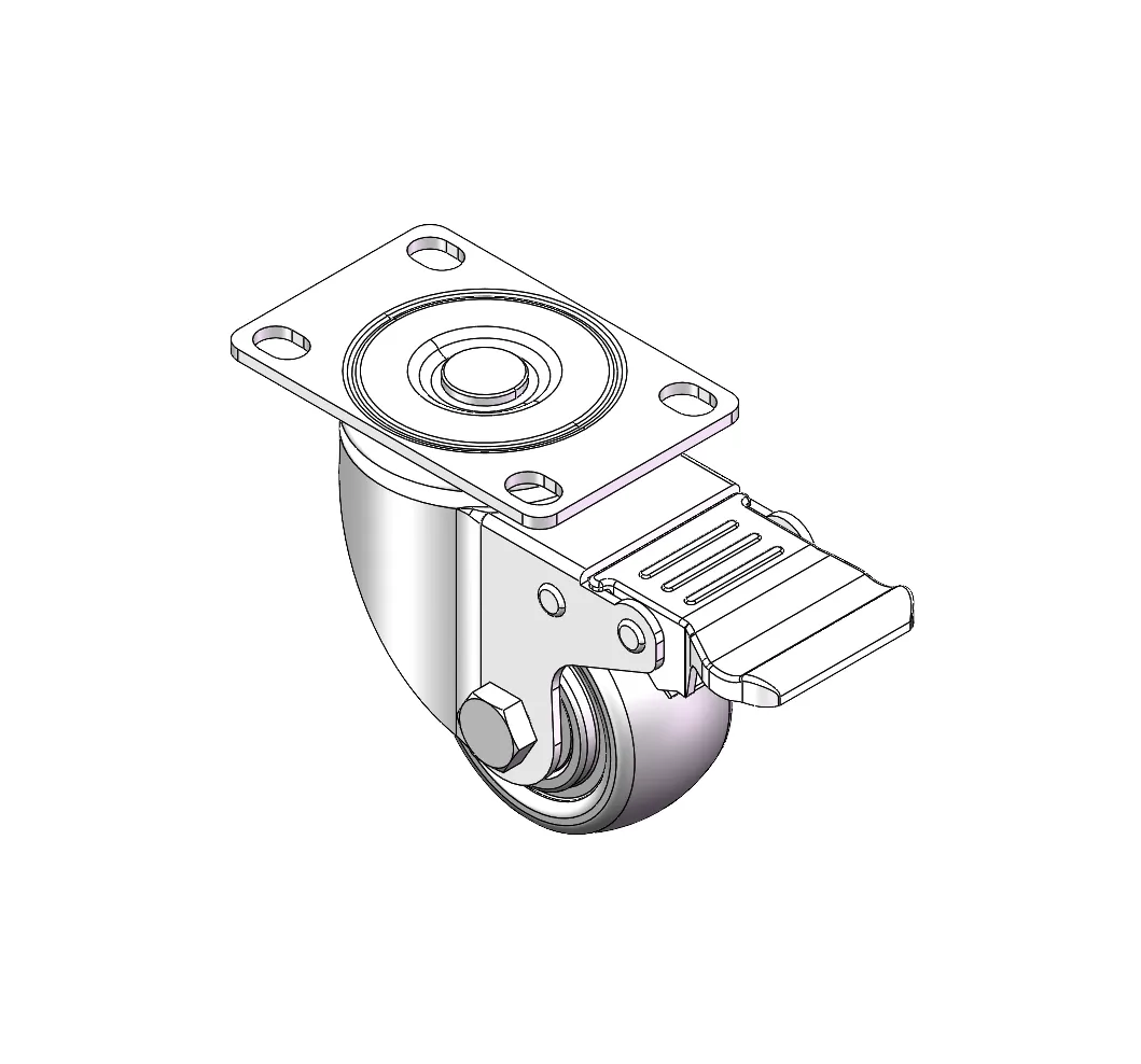 Casters with Total Brakes and a With locking system. Top Plate with Riveted, Stamping Fork and 75 x 45 mm (3" x 1-3/4") Bolt Hole Spacing.