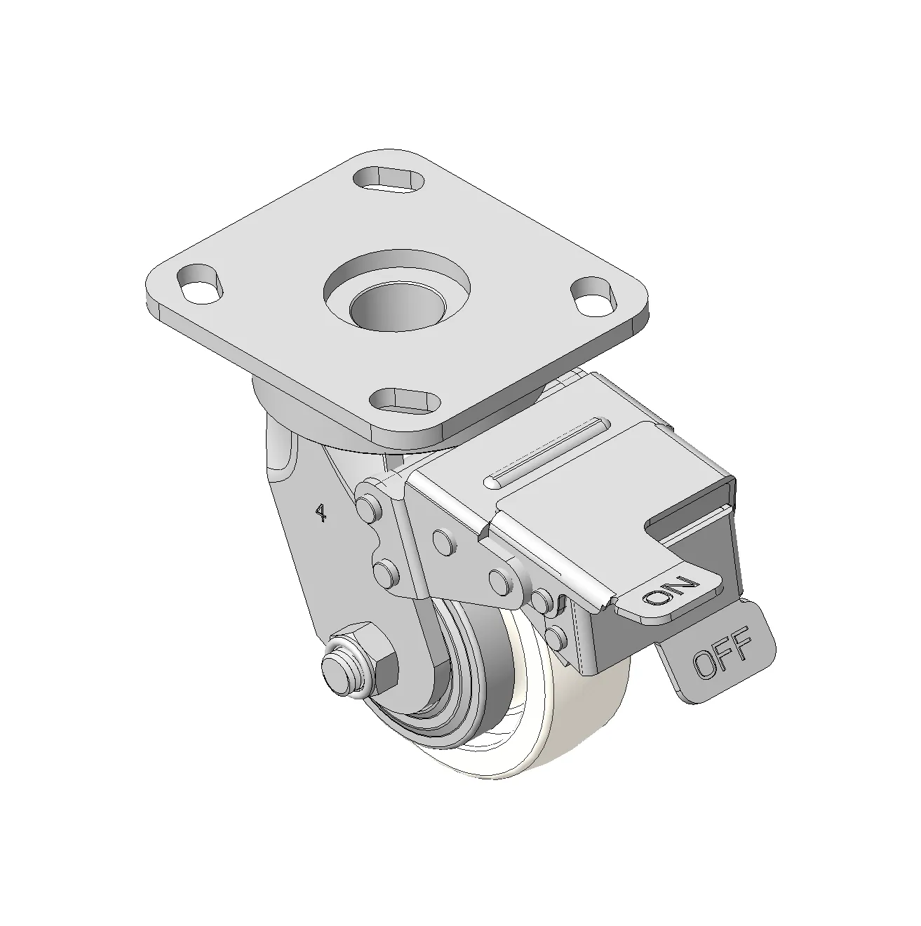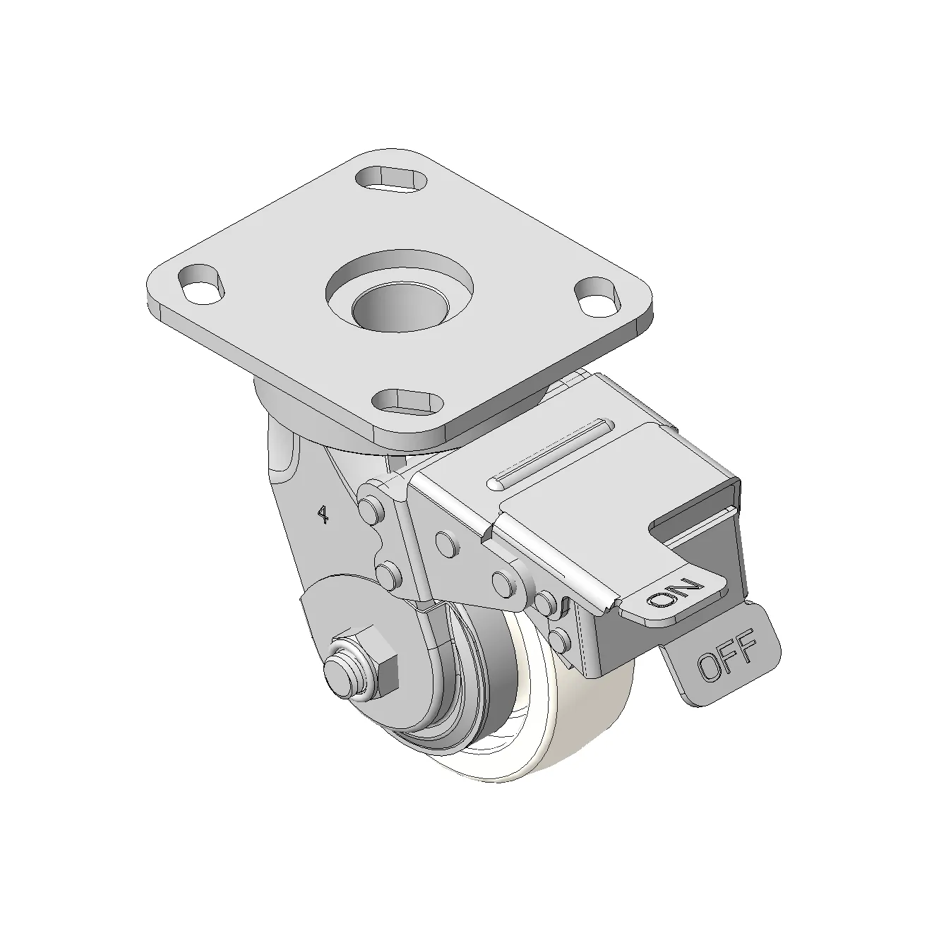 Casters with Front Brake locking system, Welded Caster Fork Extended control lever surface, Top Plate Mounting Type, Hole spacing 85x70 Polypropylene Wheel Center, Wheel Tread Natural Color Bearing - Ball Bearing