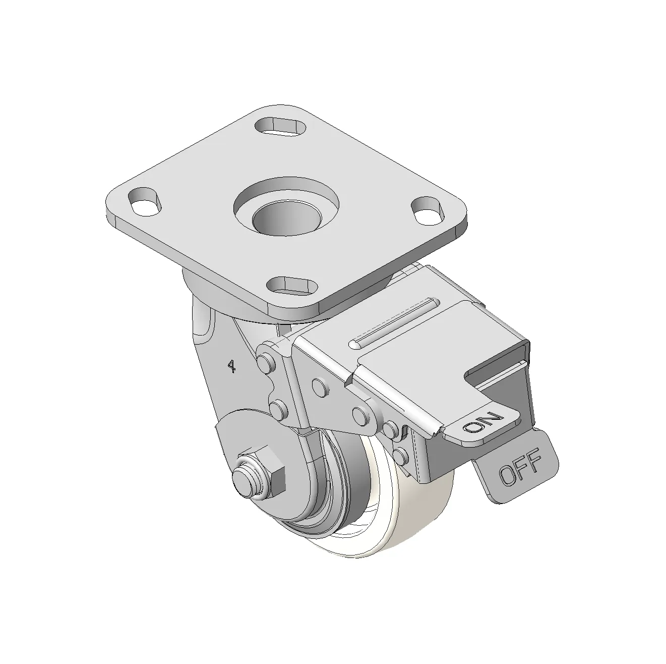 Casters with Front Brake locking system, Welded Caster Fork Extended control lever surface, Top Plate Mounting Type, Hole spacing 85x70 Polypropylene Wheel Center, Wheel Tread Natural Color Bearing - Ball Bearing, with special Anti-thread wheel cover
