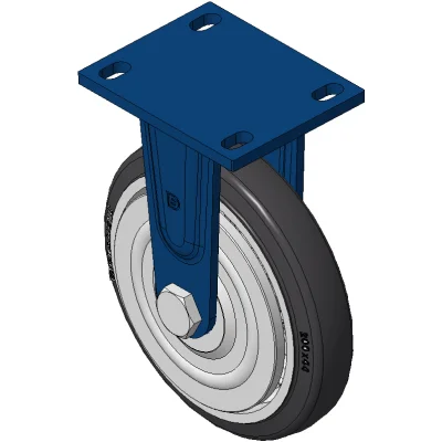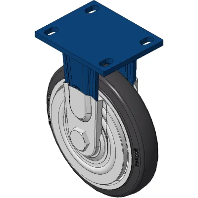 Rigid Caster with Welded Caster Fork Blue painted finish, Mounting Type - Top Plate, 110x75 Bolt Hole Spacing Cast Iron core with High-Quality, highly Resilient Rubber Wheel Tread, Cast Iron in natural finish Bearings—Ball Bearings