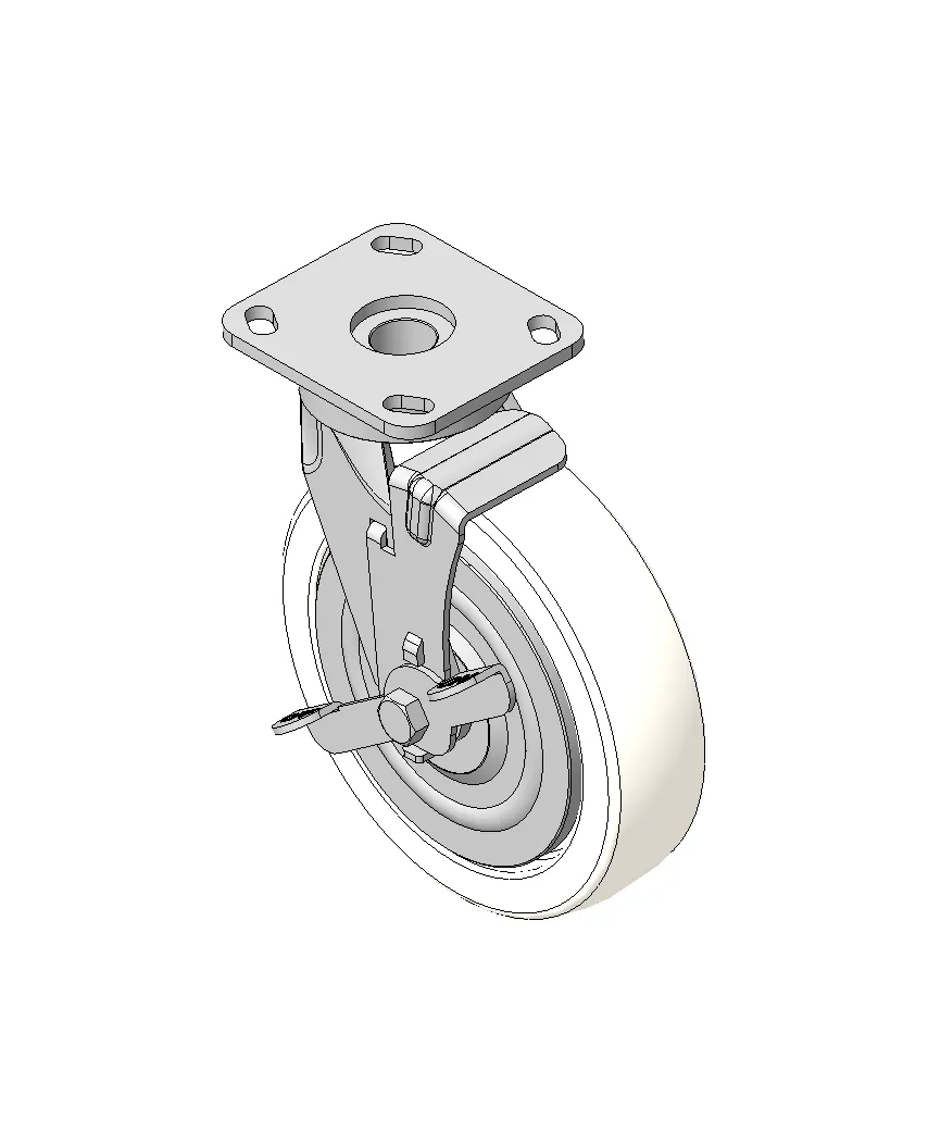 Casters with Side Brakes and Locking system, Welded Caster Fork Zine-Plated, Mounting Type - Top Plate, 85x70 Bolt Hole Spacing Reinforced Polypropylene, Natural Color tread Bearing—Ball Bearing