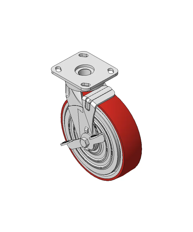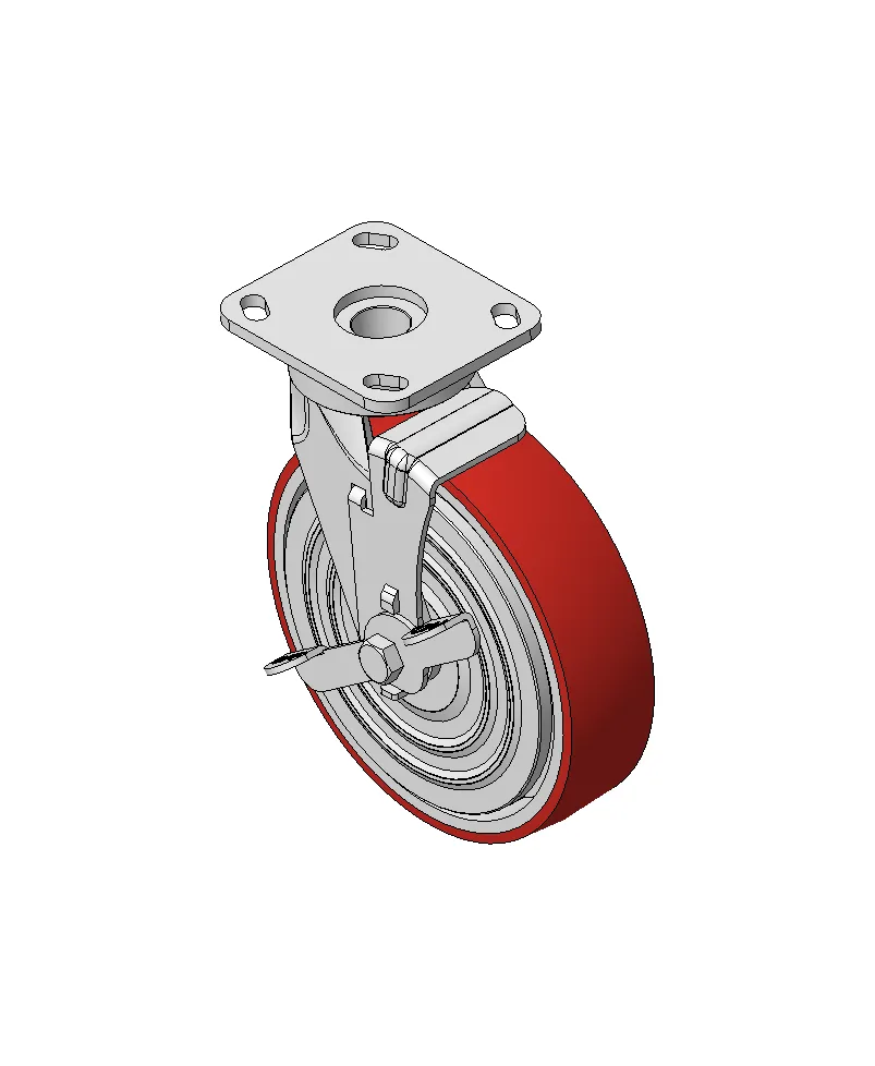 Castors with side (wheel) brakes, Locking system, Welded Caster Fork Extended control lever surface, Top Plate installation, Hole spacing 85x70 Cast Iron Wheel Center, High Quality Polyurethane Wheel Tread, Cast Iron red Bearing - Ball Bearing, with special Anti-thread wheel cover