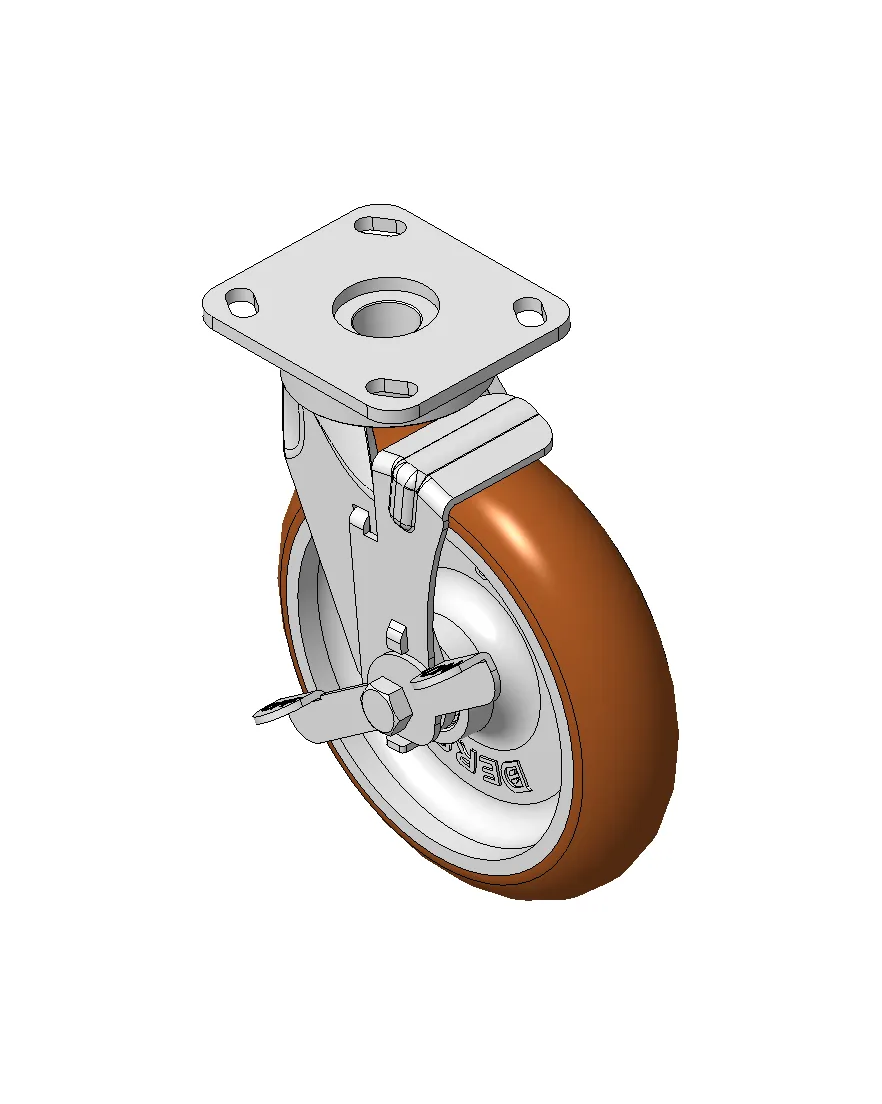 Casters with Side Brakes and Locking system, Welded Caster Fork Zine-Plated, Mounting Type - Top Plate, 85x70 Bolt Hole Spacing Cast Iron Wheel Center, High Quality Polyurethane tread, Cast Iron brown Bearing—Ball Bearing