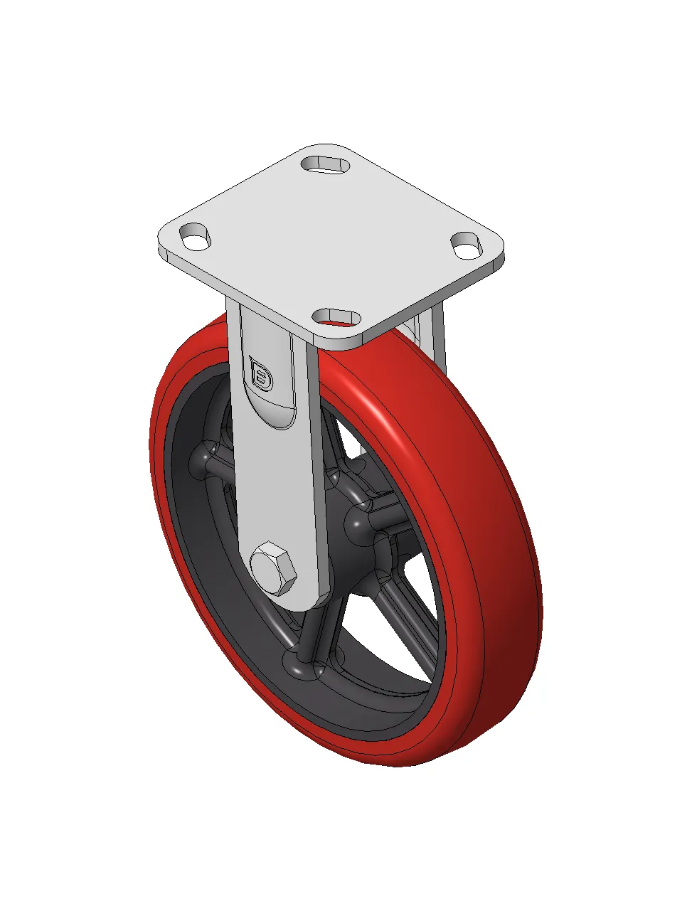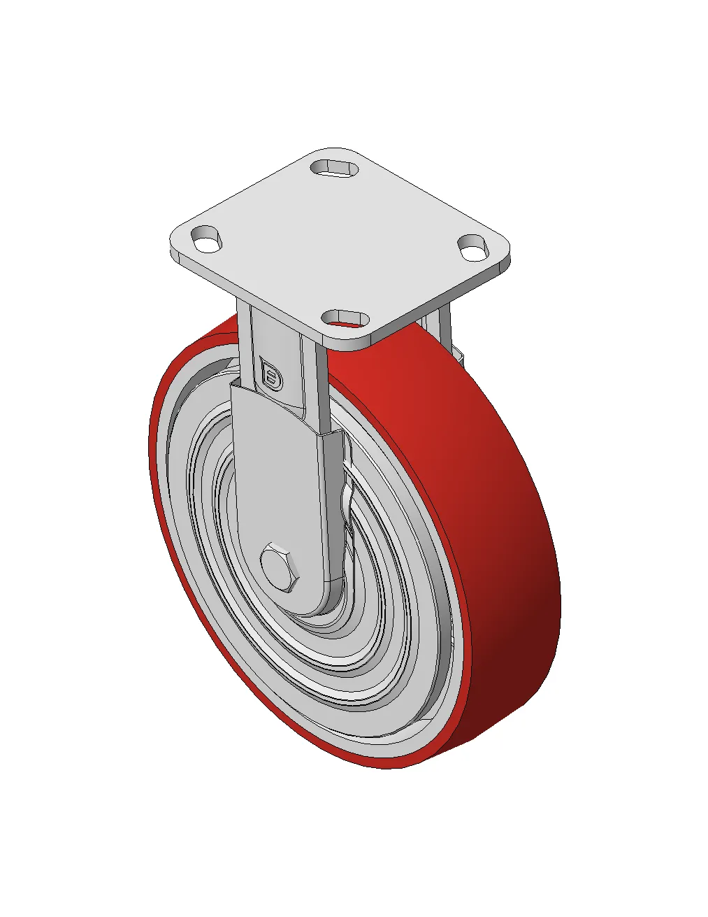 Rigid castor, Welded Caster Fork Extended control lever surface, Top Plate installation, Hole spacing 85x70 Cast Iron Wheel Center, High Quality Polyurethane Wheel Tread, Cast Iron red Bearing - Ball Bearing, with special Anti-thread wheel cover