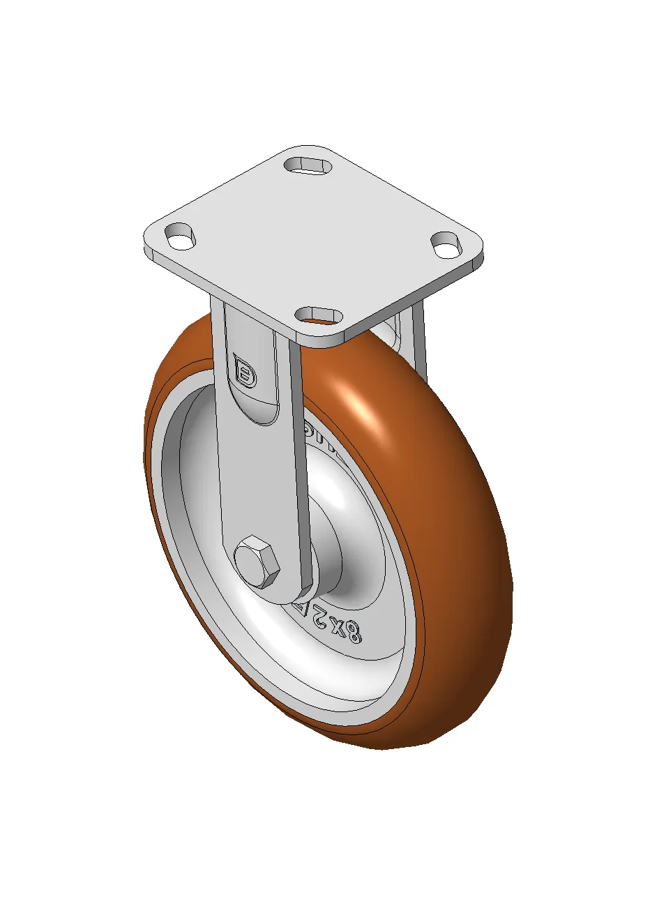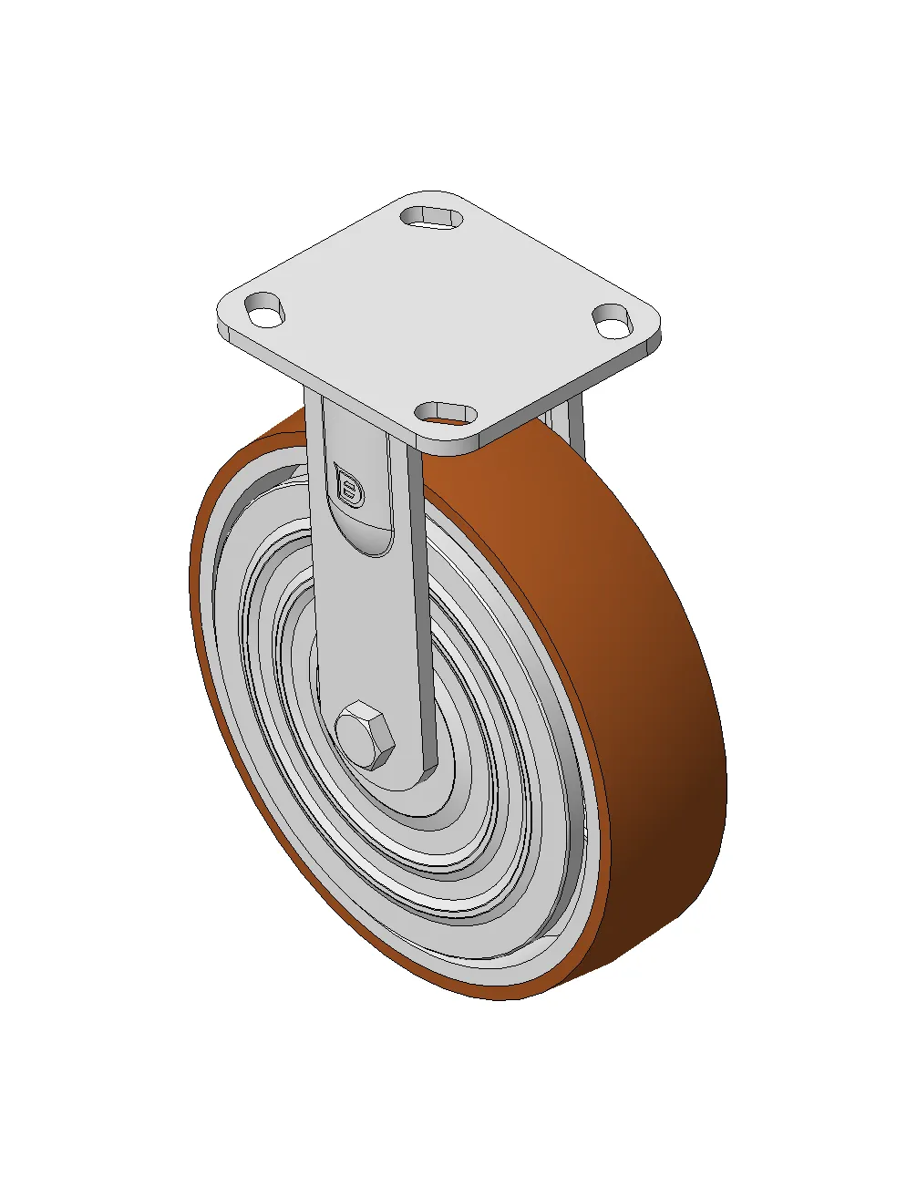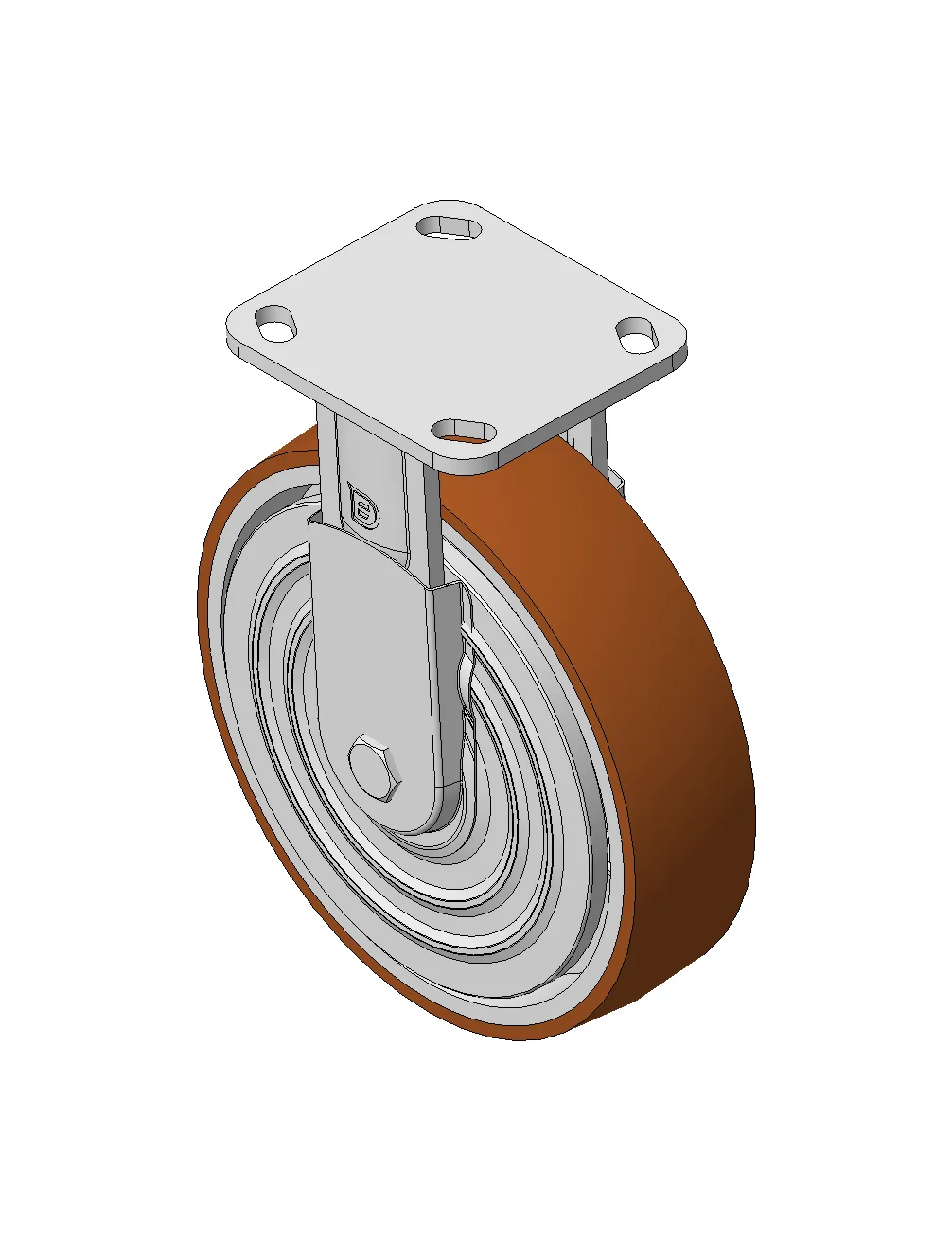 Rigid castor, Welded Caster Fork Extended control lever surface, Mounting Type - Top Plate, Hole spacing 85x70 Cast Iron Wheel Center, High Quality Polyurethane Wheel Tread, Cast Iron brown Bearing - Ball Bearing, with special Anti-thread wheel cover