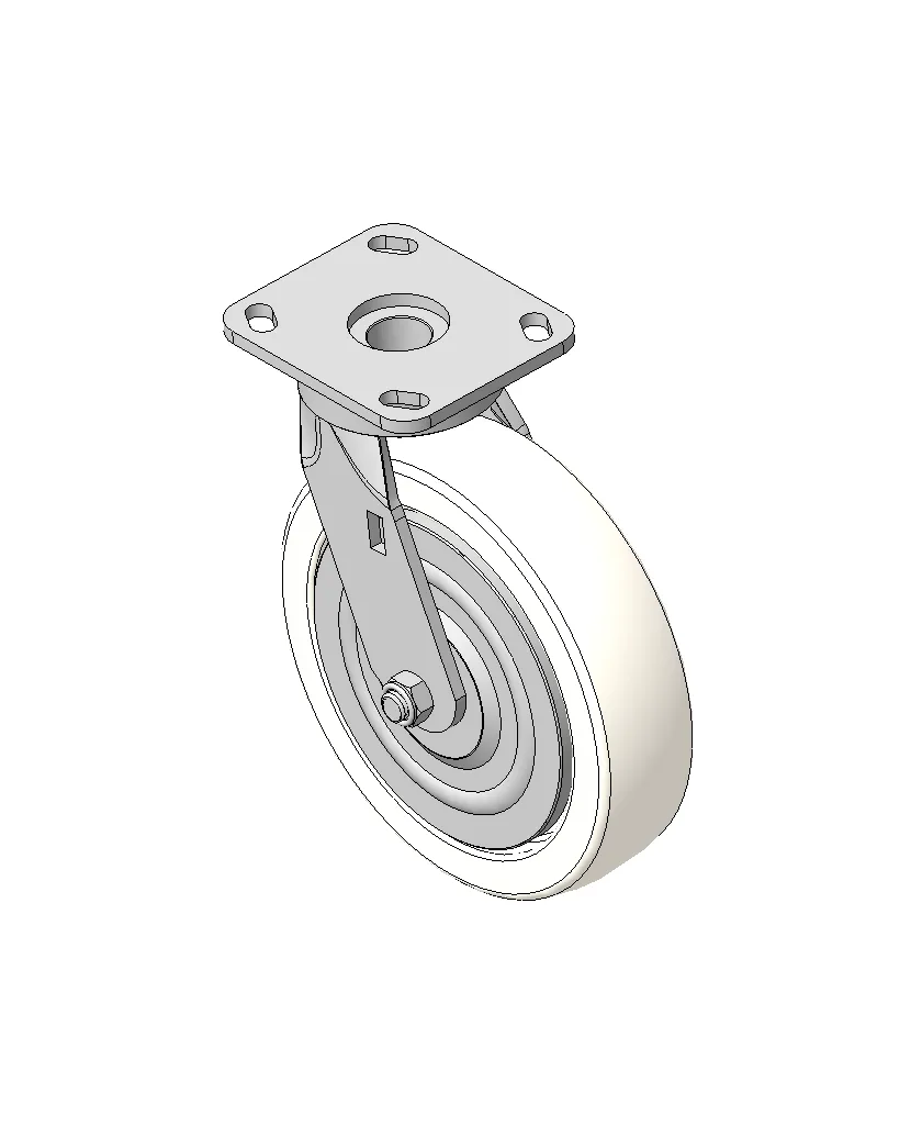 Swivel Caster, Welded Caster Fork Extended control lever surface, Top Plate Mounting Type, Hole spacing 85x70 Polypropylene Wheel Center and Wheel Tread, Natural Color Bearing - Ball Bearing
