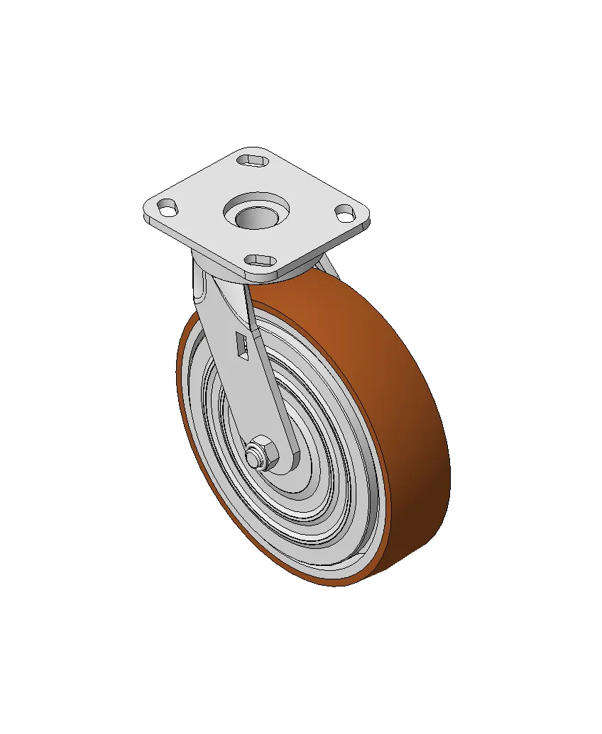 Swivel Caster, Welded Caster Fork Extended control lever surface, Top Plate Mounting Type, Hole spacing 85x70 Cast Iron Wheel Center, High Quality Polyurethane Wheel Tread, Cast Iron brown Bearing - Ball Bearing, with special Anti-thread wheel cover