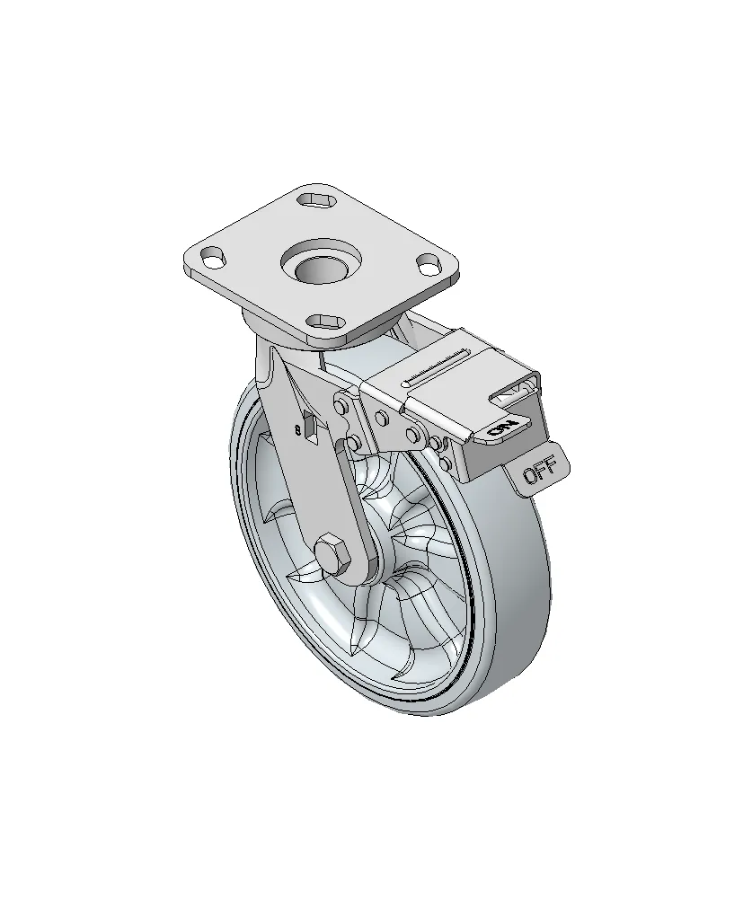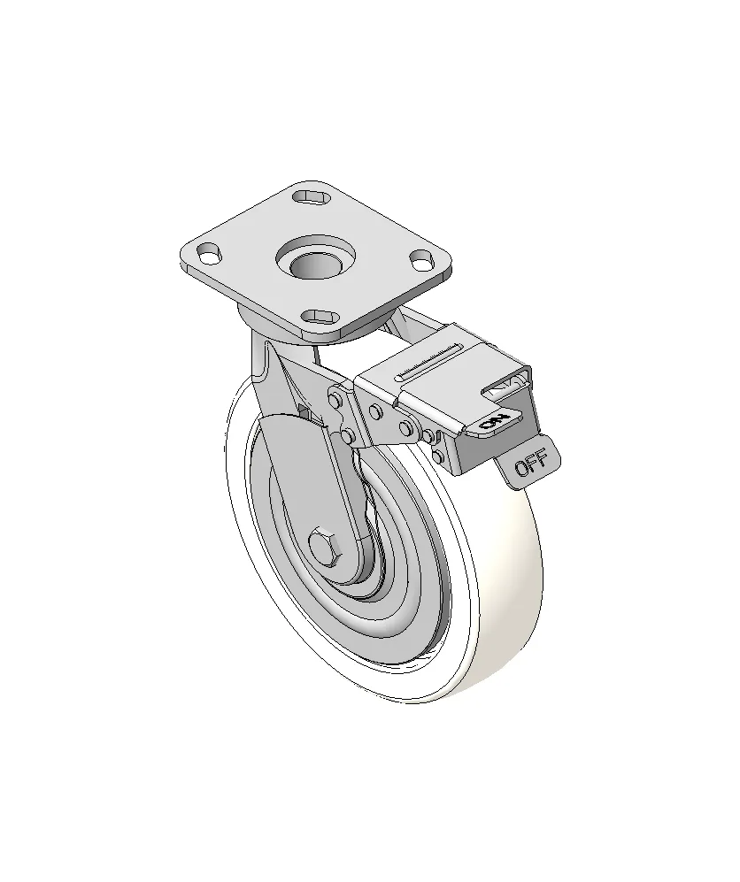 Caster with Front Brake locking system, Welded Caster Fork Zine-Plated, Mounting Type - Top Plate, 85x70 Bolt Hole Spacing Cast Iron Wheel Center, High Quality Polyurethane tread, pearlescent light gray Bearing—Ball Bearing
