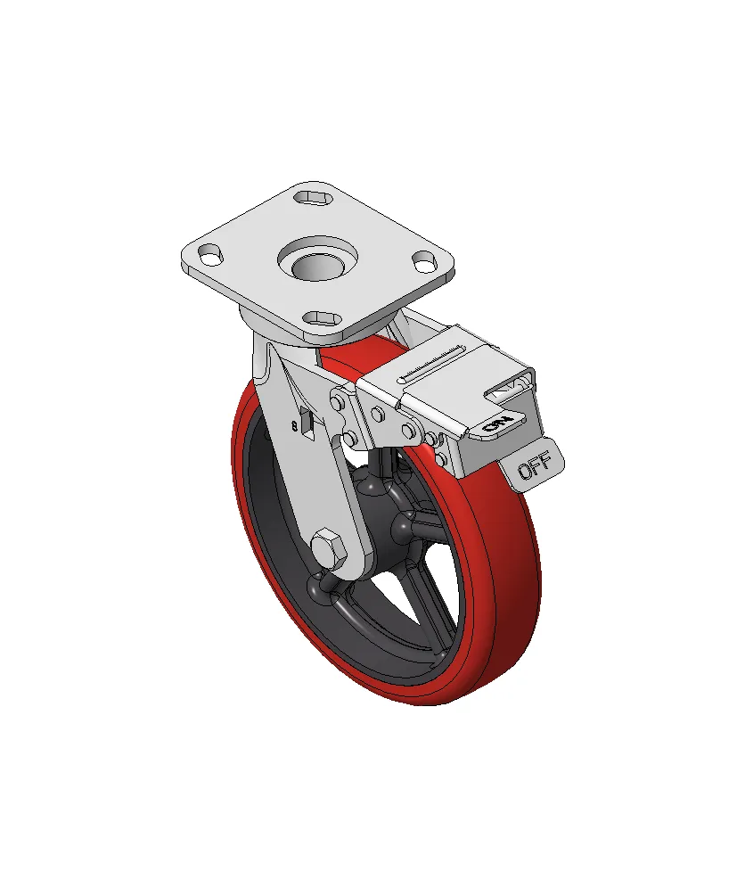 Casters with directional brakes and Locking system, Welded Caster Fork Zine-Plated, Mounting Type - Top Plate, 85x70 Bolt Hole Spacing Cast Iron Wheel Center, High Quality Polyurethane tread, Cast Iron red Bearing—Ball Bearing with special anti-wrap caps