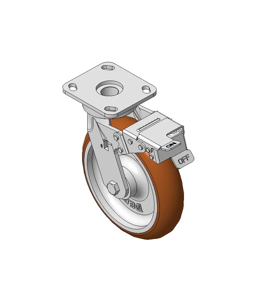 Casters with Directional Lock locking system, Welded Caster Fork Zine-Plated, Mounting Type - Top Plate, 85x70 Bolt Hole Spacing Cast Iron Wheel Center, High Quality Polyurethane tread, Cast Iron brown Bearing—Ball Bearing