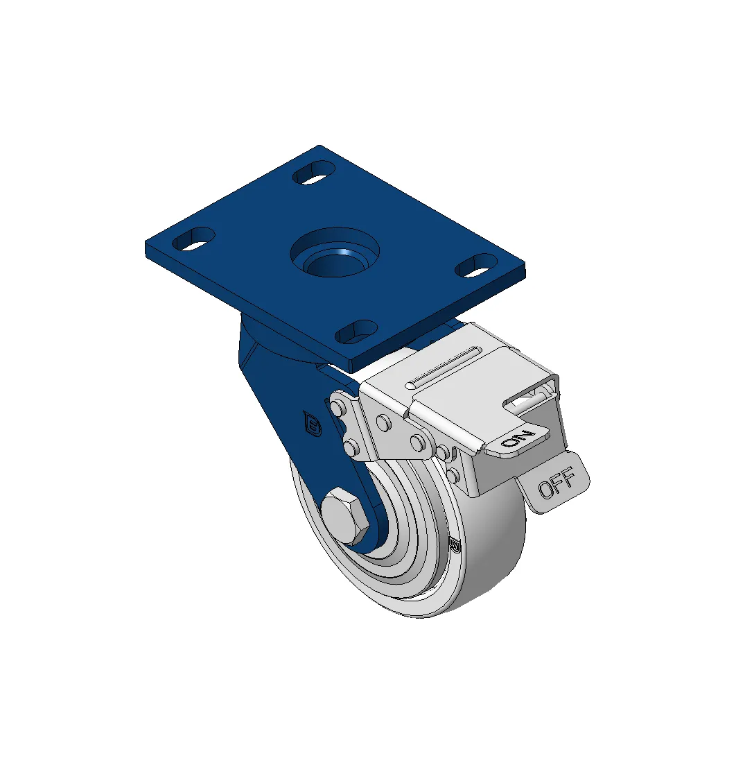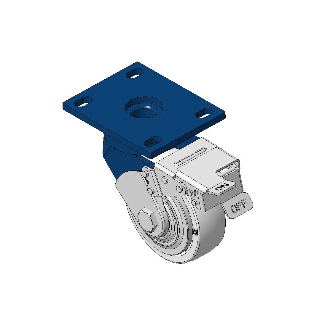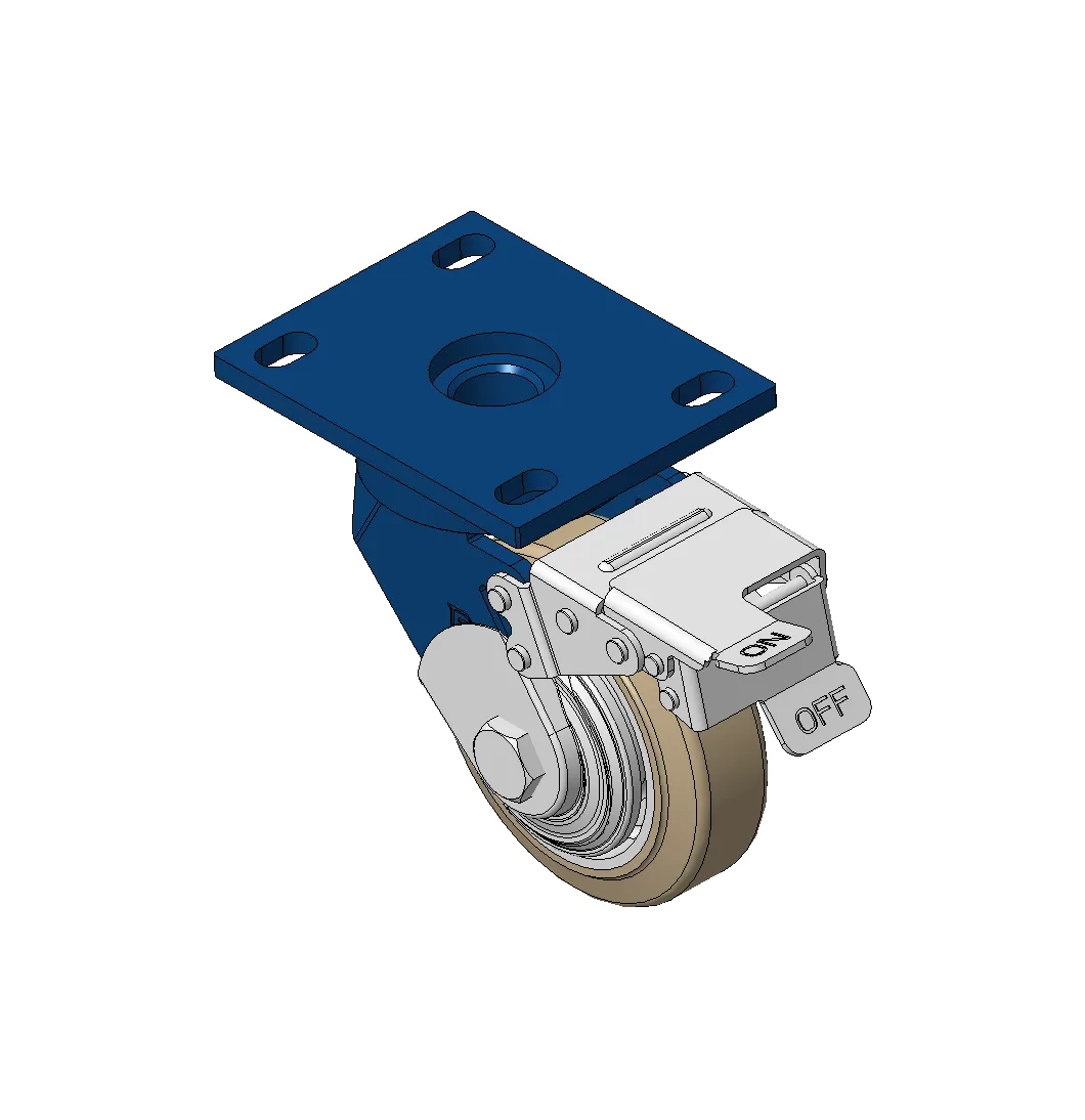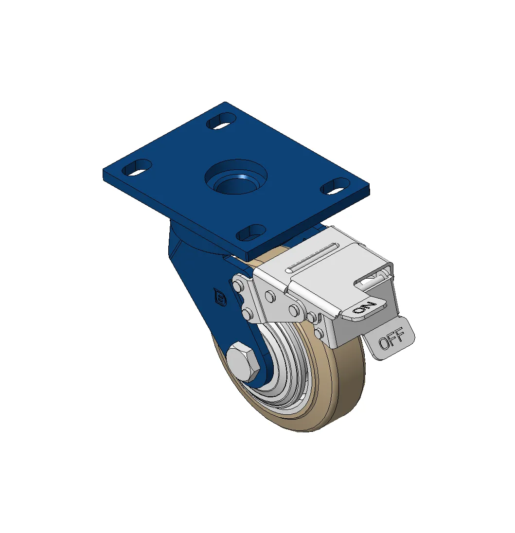 Casters with front brake and With locking system, Welded Caster Fork Blue-painted finish, Mounting Type - Top Plate, 110x75 Bolt Hole Spacing Cast Iron core, High Quality Polyurethane Wheel Tread Cast Iron brown, Bearing – Ball Bearings