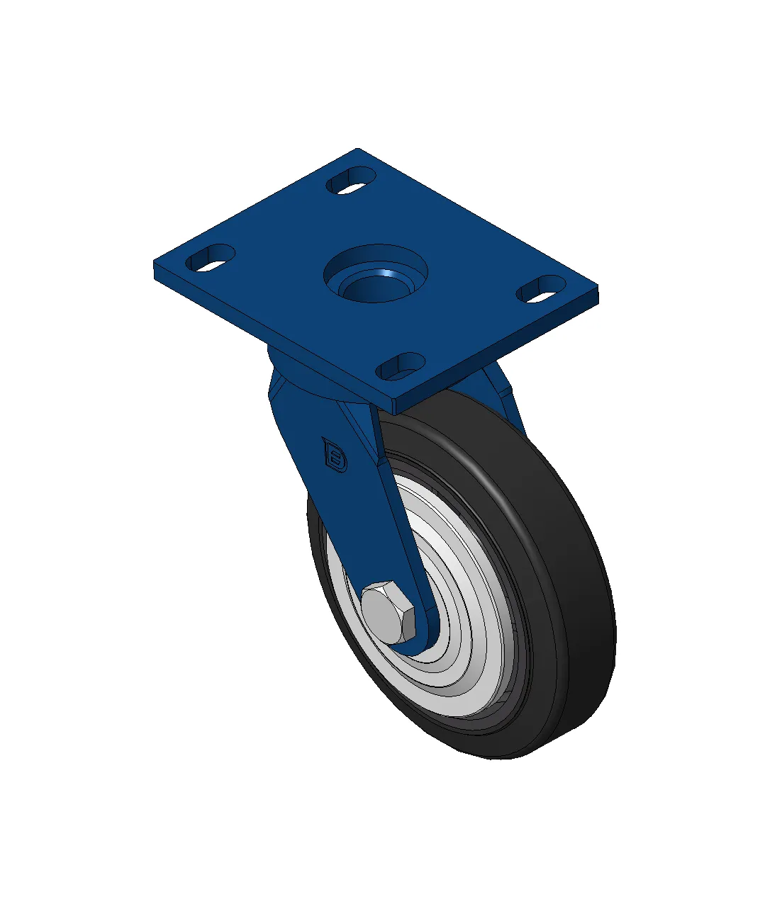 Swivel Caster with Welded Caster Fork Blue-painted finish, Mounting Type - Top Plate, 85x70 Bolt Hole Spacing Cast Iron Wheel Center with High-Quality, highly Resilient Rubber tread, Cast Iron black Bearing—Ball Bearing