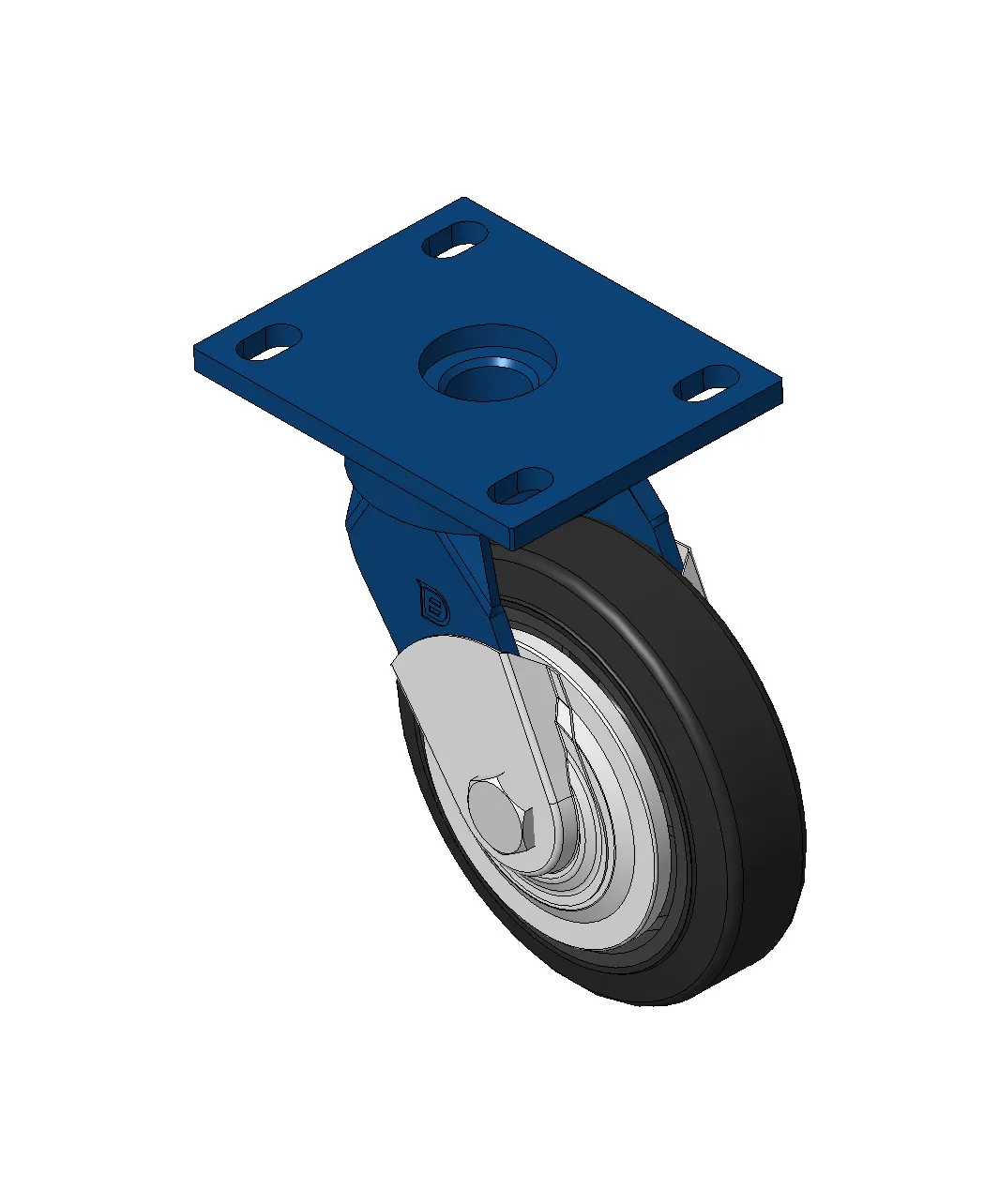 Swivel Caster with Welded Caster Fork Blue-painted finish, Mounting Type - Top Plate, 85x70 Bolt Hole Spacing Cast Iron Wheel Center, High-Quality, highly Resilient Rubber tread, Cast Iron black Bearing—Ball Bearing with special anti-wrap wheel cap