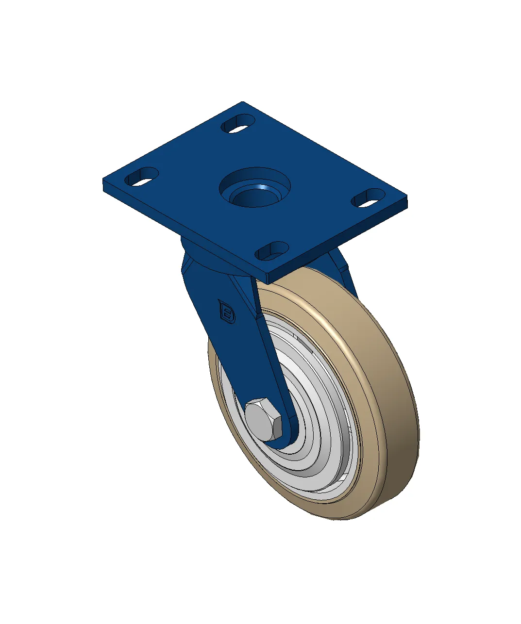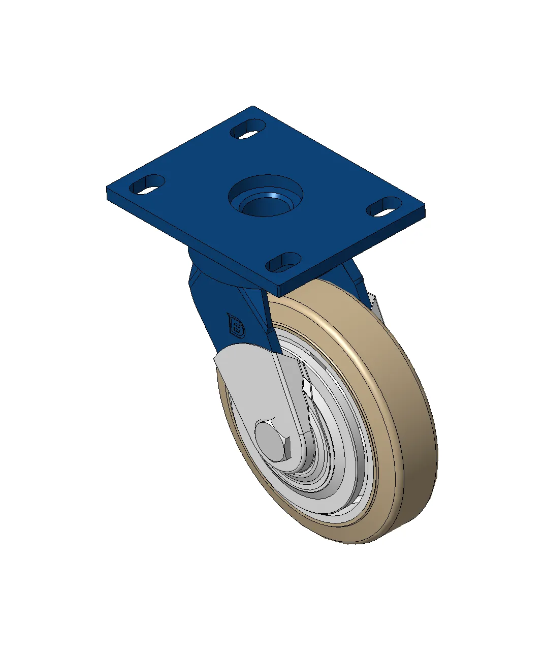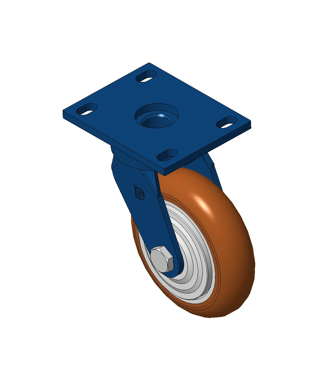 Swivel Casters, Welded Caster Fork Surface sprayed with blue paint, Top Plate installation device, Hole spacing 85x70 Wheel core made of cast iron, high quality polyurethane Wheel Tread, Cast Iron brown Bearing—Ball Bearing