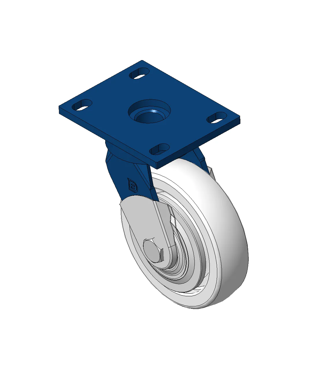 Swivel Casters, Welded Caster Fork Surface sprayed with blue paint, Mounting Type - Top Plate, Hole spacing 85x70 Polypropylene Wheel Center, Wheel Tread Natural Color Bearing—Ball Bearing