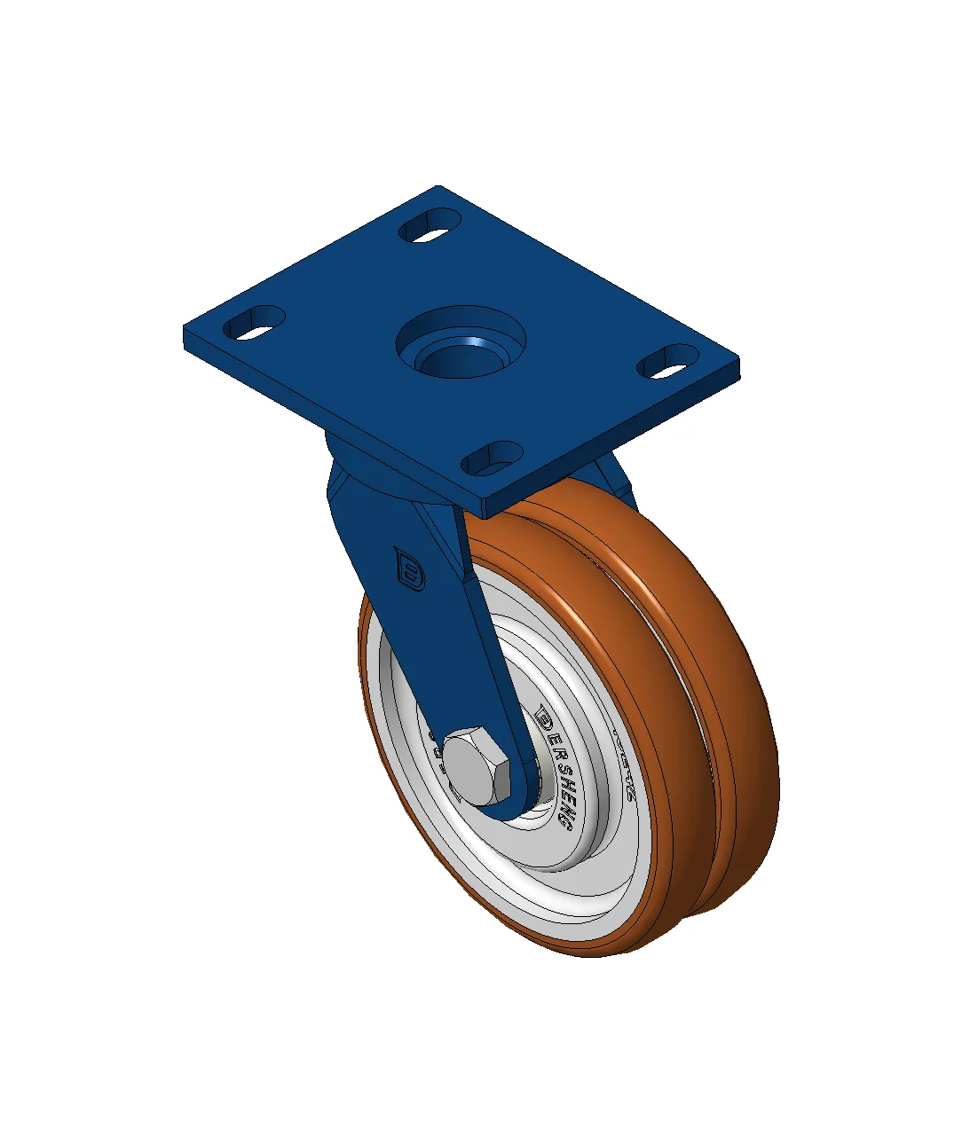 Swivel Casters, Welded Caster Fork Surface sprayed with blue paint, Top Plate installation device, Hole spacing 85x70 Wheel core made of cast iron, high quality polyurethane Wheel Tread, Cast Iron brown Bearing—special Ball Bearings to reduce Rolling Resistance ZQPU double wheels, Ergonomic design, easier to start and turn