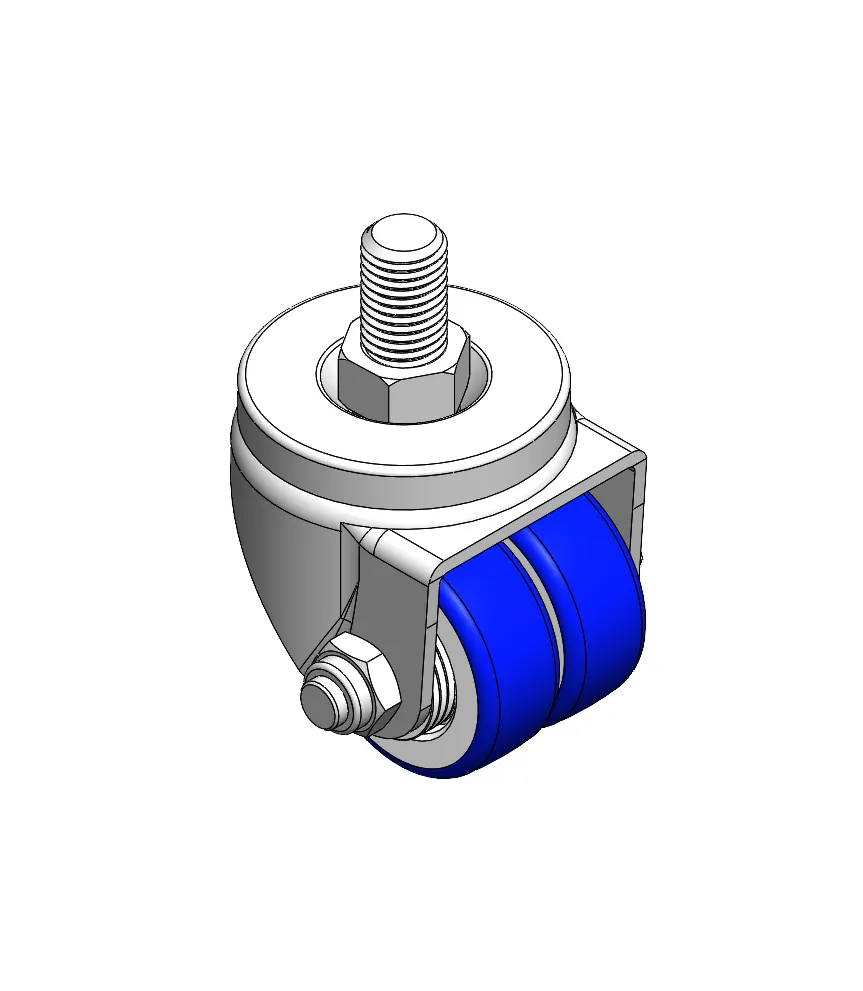 Swivel Caster, thread-Riveted Stamping Fork—M16-P2 Zine-Plated, Mounting Type - Threaded Stem Cast Iron Wheel Center, High Quality Polyurethane tread Blue color, Bearing—Ball Bearing.