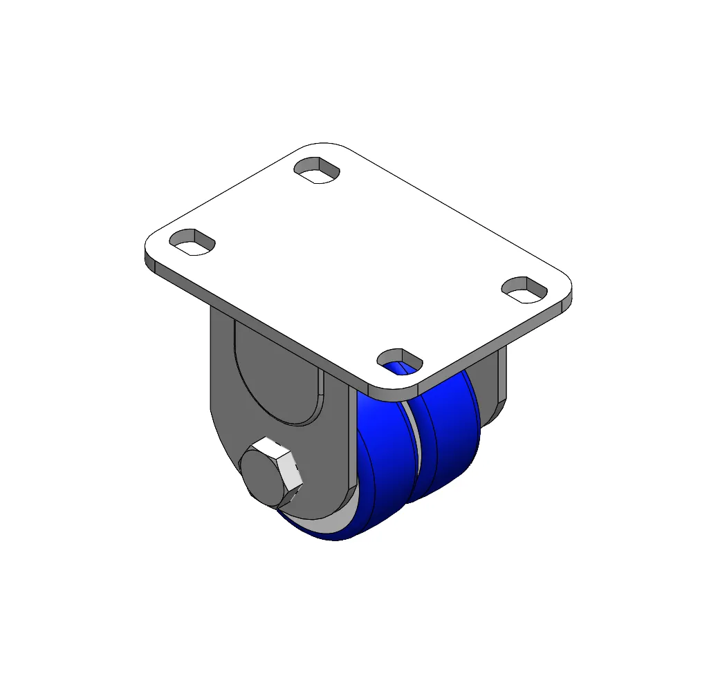 Rigid Caster, Welded-on footplate with 75 x 45 mm (3" x 1-3/4") Bolt Hole Spacing Zine-Plated, Mounting Type - Top Plate Cast Iron Wheel Center, High Quality Polyurethane tread Blue color, Bearing—Ball Bearing.