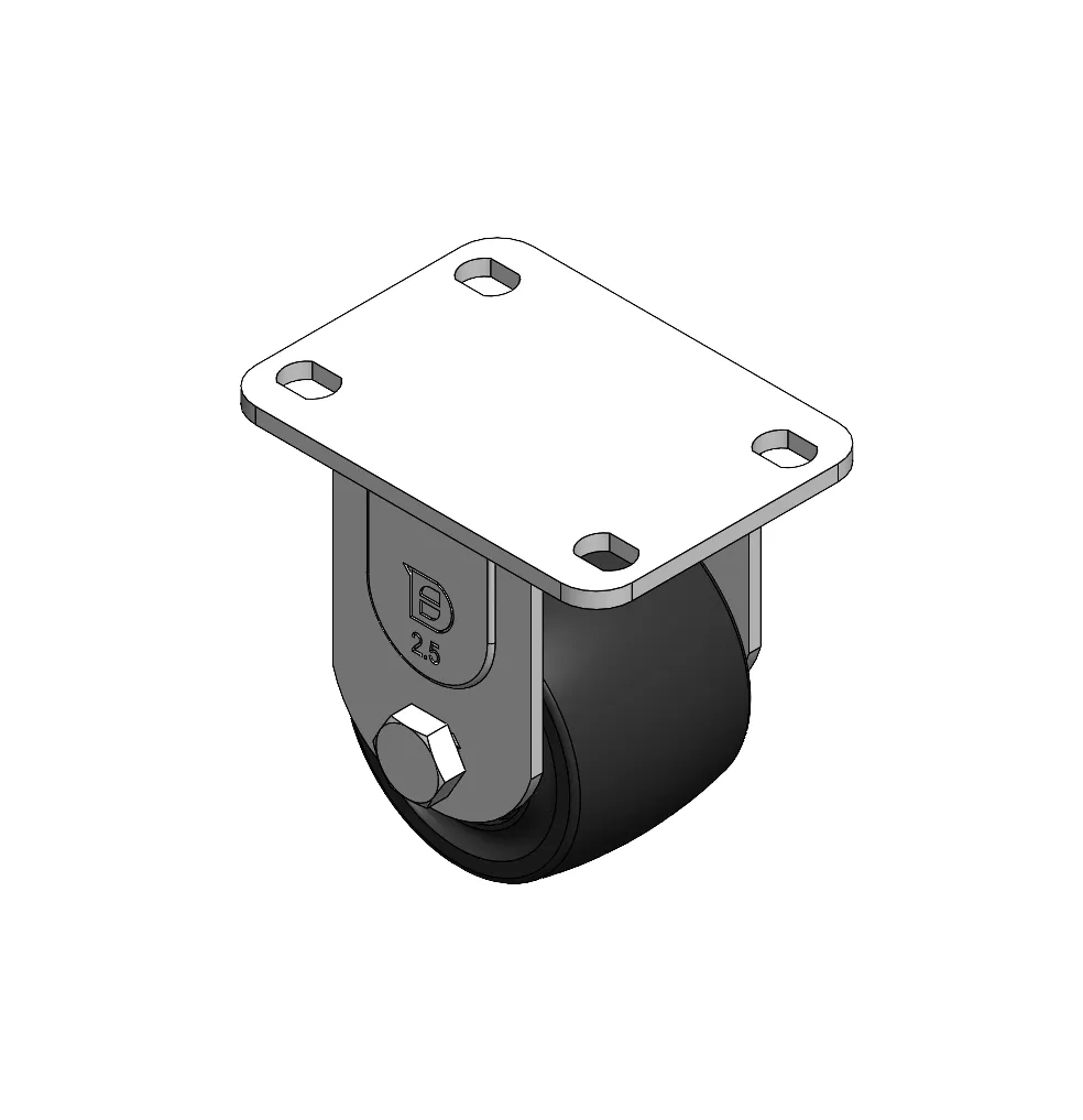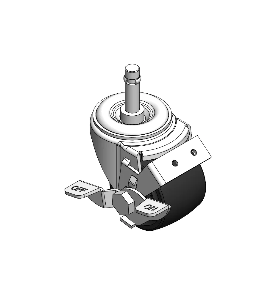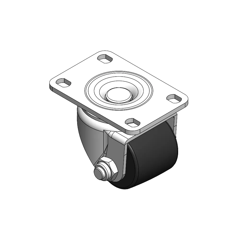 Rigid Casters, Welded footplates—75 x 45 mm (3" x 1-3/4") Bolt Hole Spacing Extended control lever surface, Mounting Type - Top Plate Reinforced Polypropylene and Wheel Tread Bearing—Ball Bearing.