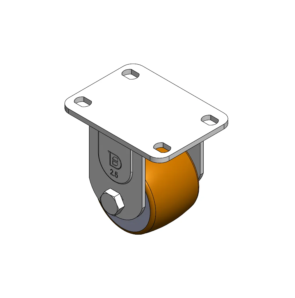 Rigid Caster, Welded-on foot with 75 x 45 mm (3" x 1-3/4") Bolt Hole Spacing Zine-Plated, Mounting Type - Top Plate Steel core, High Quality Polyurethane tread Brown, Bearing—Ball Bearing.