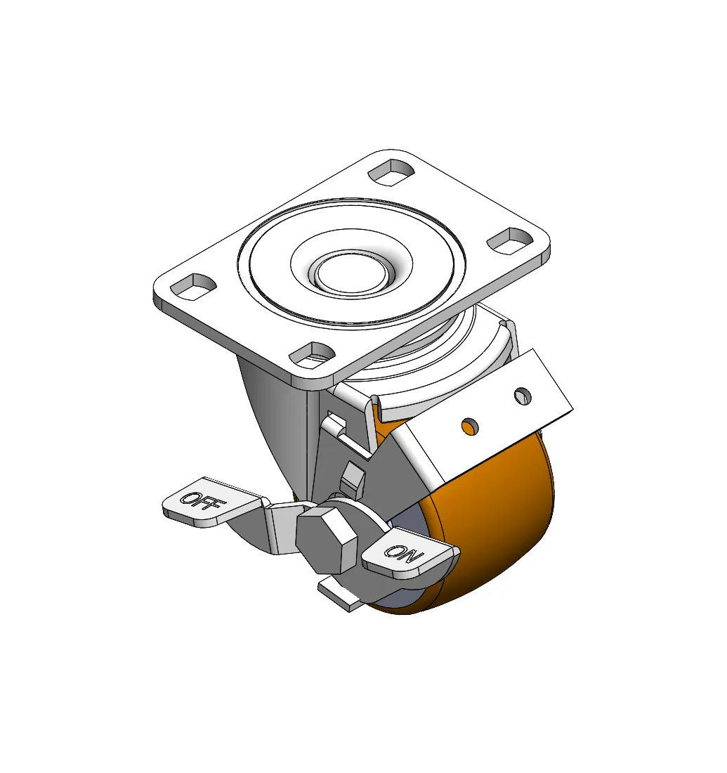Side Brake Locking system Top Plate Riveted and Stamping with 75 x 45 mm (3" x 1-3/4") Bolt Hole Spacing. Zine-Plated, Mounting Type - Top Plate. Cast Iron Wheel Center, High Quality Polyurethane tread. Brown color, Bearing—Ball Bearing.