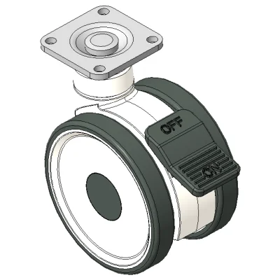 Total Brake Caster, 42.5 x 42.5 mm beveled hole Fork, white Fork with reinforced Polypropylene Rustproof, Corrosion resistant, and flexible, suitable for low- and medium-sized trolleys High-Quality Impact-Resistant Polypropylene Wheel Center, High-Quality Reinforced Polypropylene Rubber (TPR) Wheel Tread Dark gray, Bearing: Ball Bearings