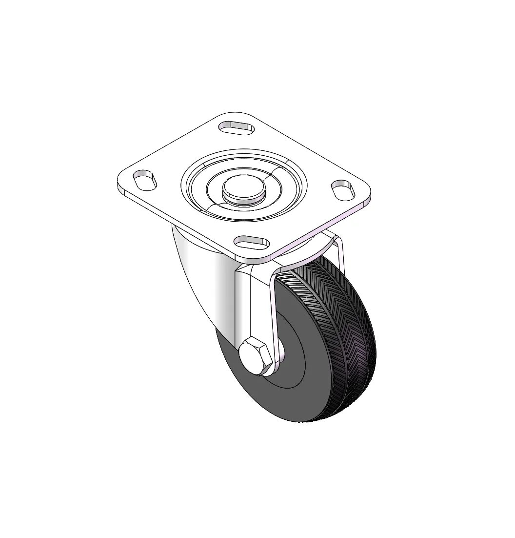 Swivel Caster with Riveted Fork and Stamping Fork—D-shaped hole. Zine-Plated, Fork-mounted (4T) Mounting Type system. Cast Iron Wheel Center with High-Quality Resilient Rubber tread. Black, Bearing—Ball Bearing.