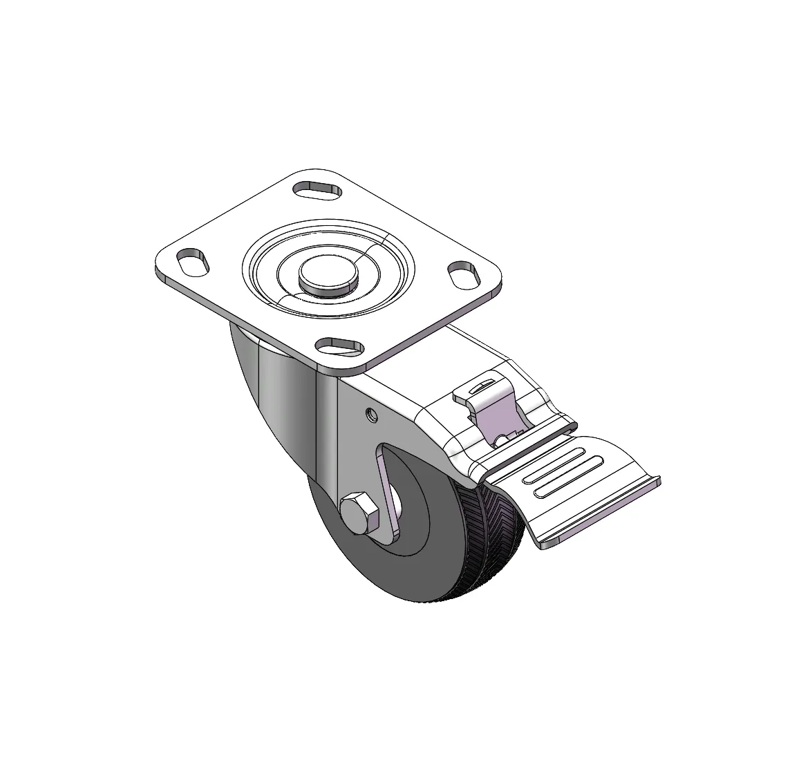 Casters with Total Brakes and a Locking system. Top Plate Riveted and Stamping with 85 x 70mm (3-3/8" x 2-3/4") Bolt Hole Spacing. E-Coat Finish, Top Plate (4T) Mounting Type. Cast Iron Wheel Center with High-Quality Resilient Rubber tread. Black, Bearing with Ball Bearing.