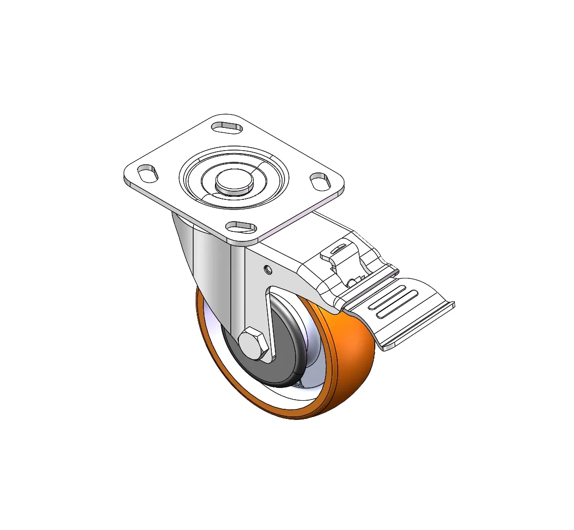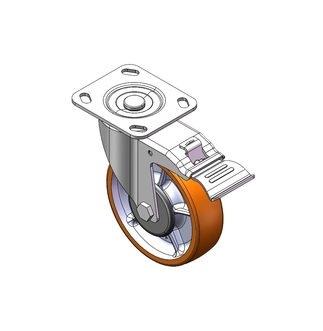 Casters with Total Brakes and a Locking system. Top Plate Riveted and Stamping 85 x 70mm (3-3/8" x 2-3/4") Bolt Hole Spacing. E-Coat Finish, Top Plate (4T) Mounting Type. Cast Iron Wheel Center with High Quality Polyurethane tread. Brown color, Bearing with Ball Bearing.